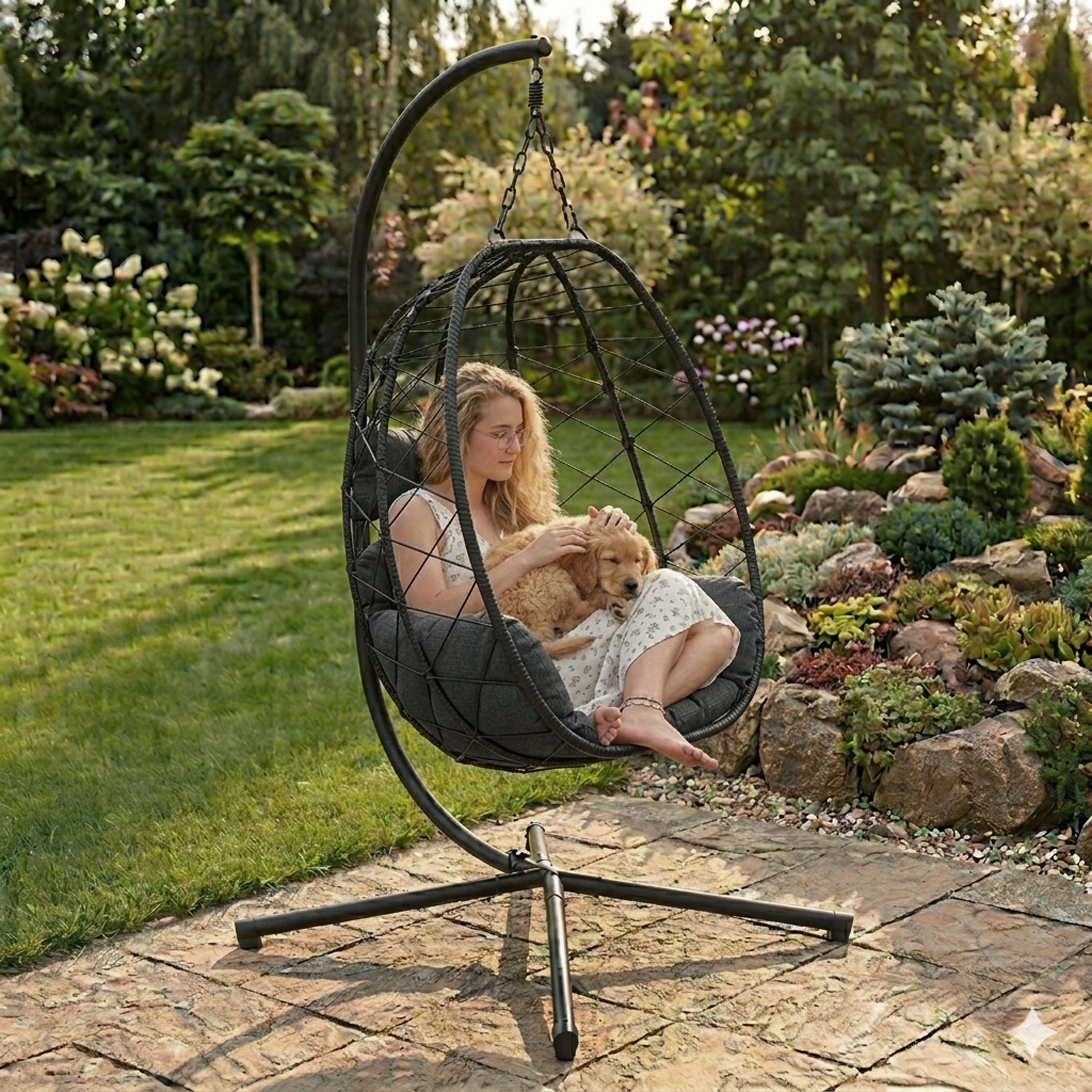 Odkrijte novo definicijo sprostitve. Eleganten kokon/jajčast dizajn ustvarja prijetno zasebnost in oblikovni poudarek za vsak prostor. Nežno zibanje v kombinaciji z debelimi blazinami prinaša vrhunsko udobje pri branju, delu ali počitku.