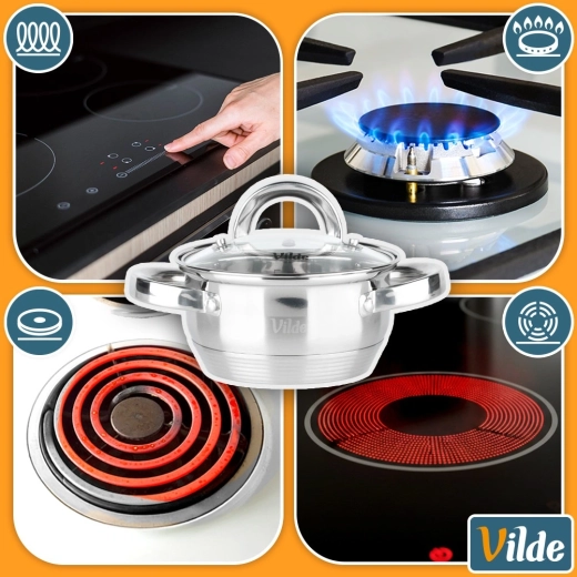 Primeren za plin, elektriko, steklokeramiko, halogen in indukcijo. Uporaben v pečici do 150 °C in pralen v pomivalnem stroju.