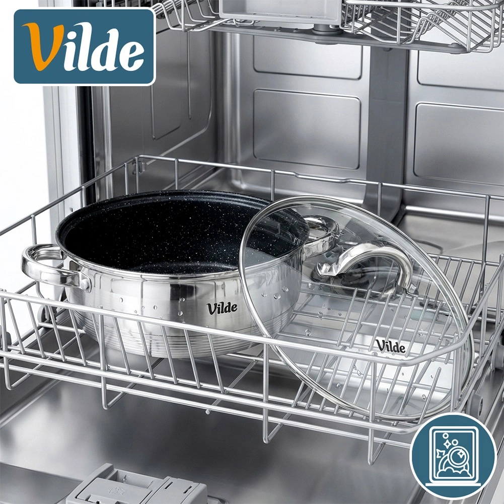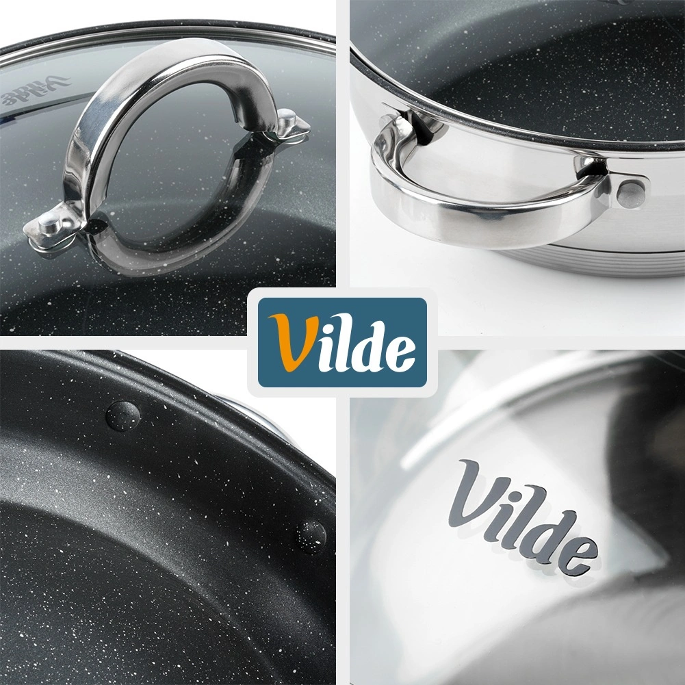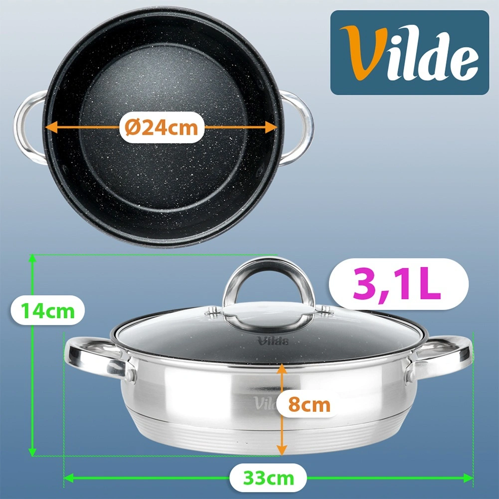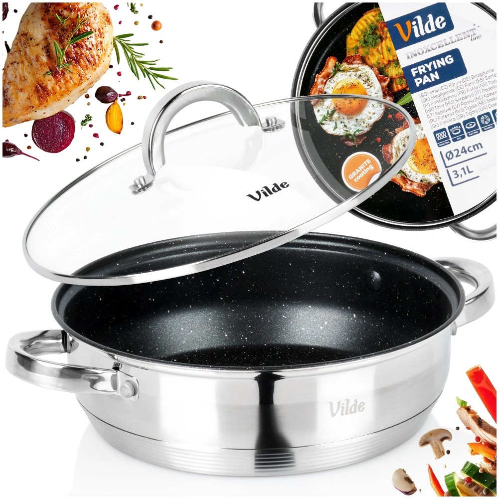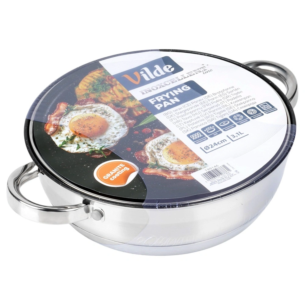 Notranjost ponve je opremljena z odporno neprijemljivo plastjo z granitnim učinkom, zunanjost pa združuje mat in visoko polirano obdelavo. Izdelek izpolnjuje evropske standarde kakovosti. Originalni izdelek znamke Vilde iz linije INOXCELLENT.