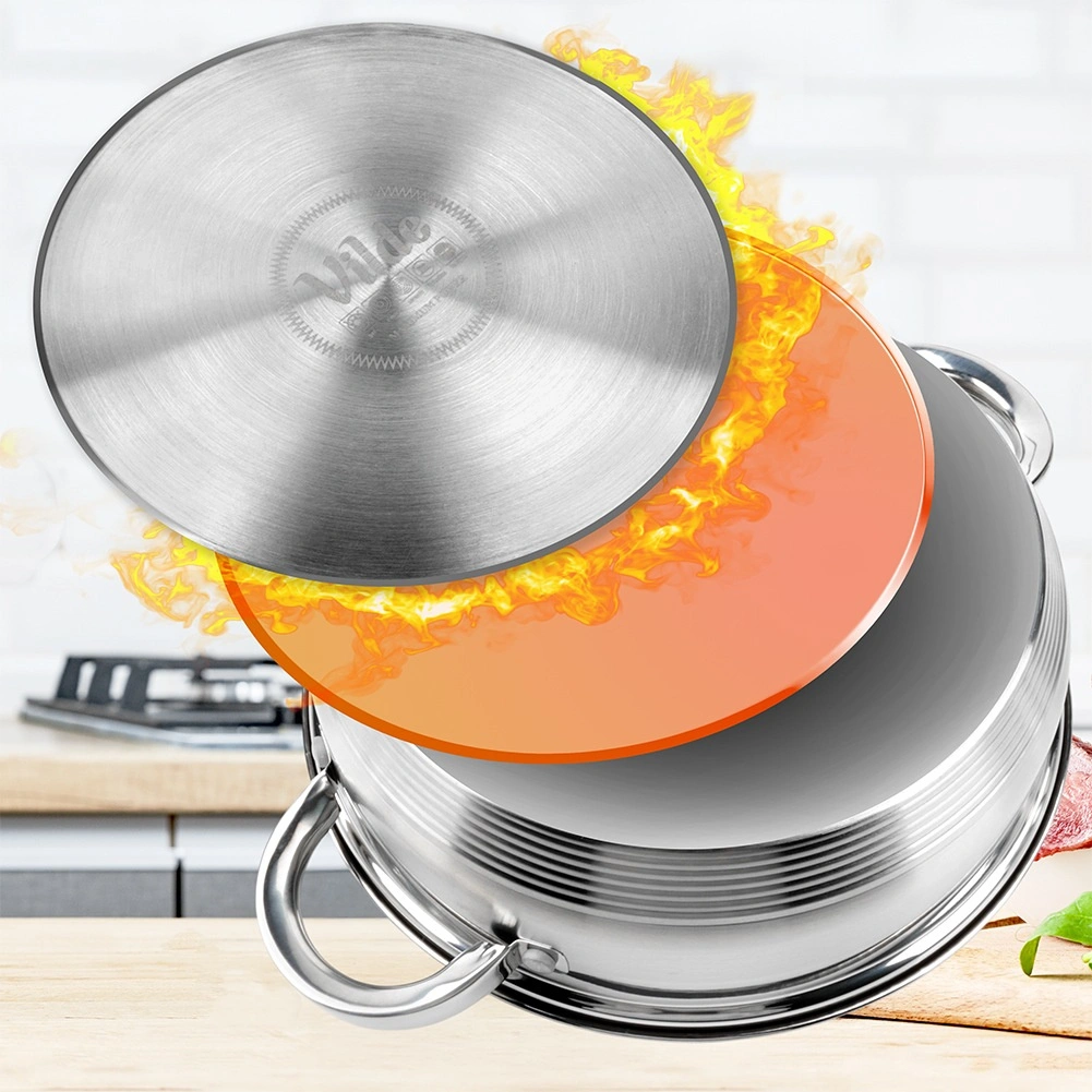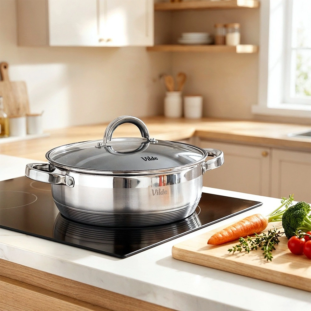 Večslojno, popolnoma ravno dno učinkovito akumulira in enakomerno porazdeljuje toploto. Varčuje z energijo in zagotavlja stabilne rezultate na vseh vrstah kuhalnih plošč, vključno z indukcijo.