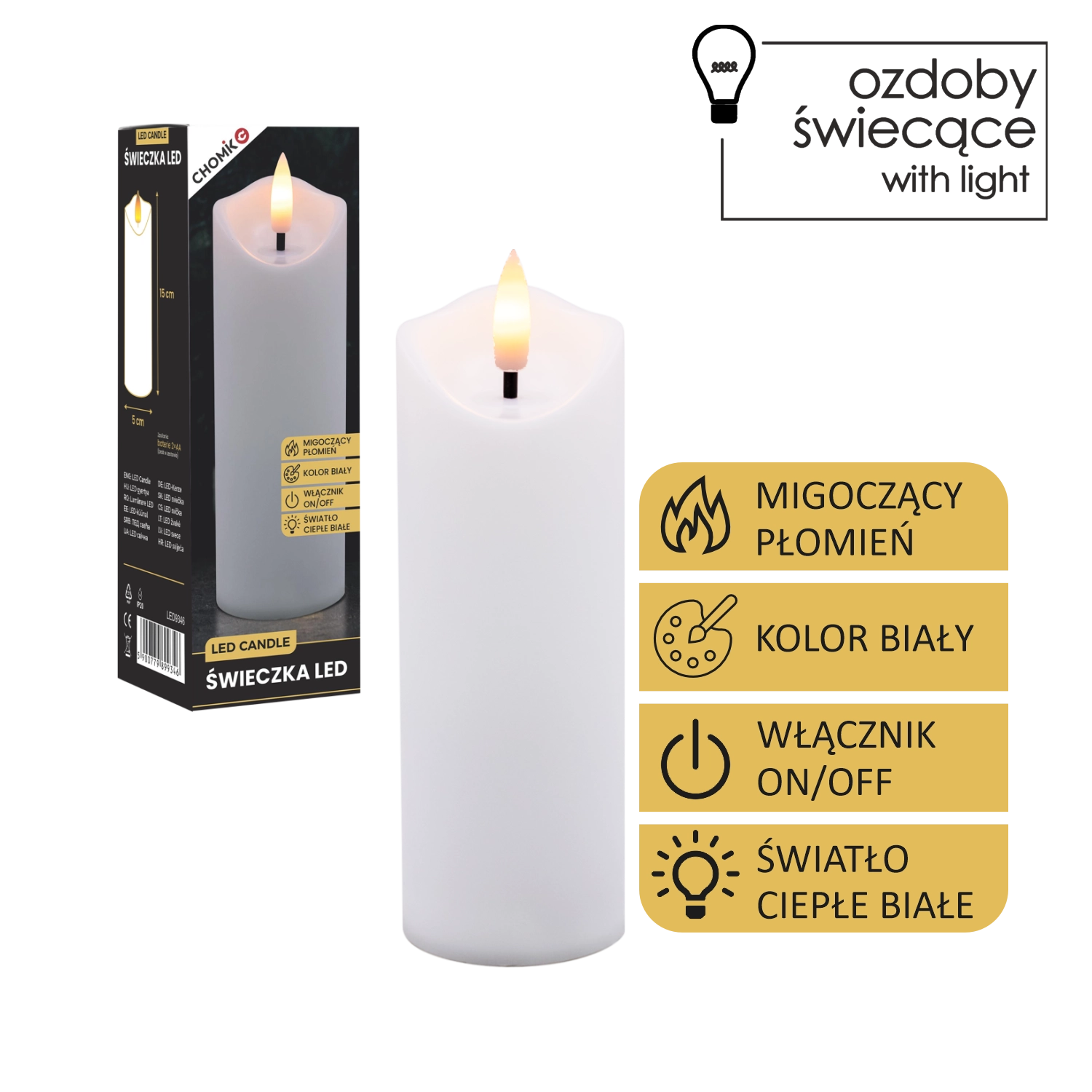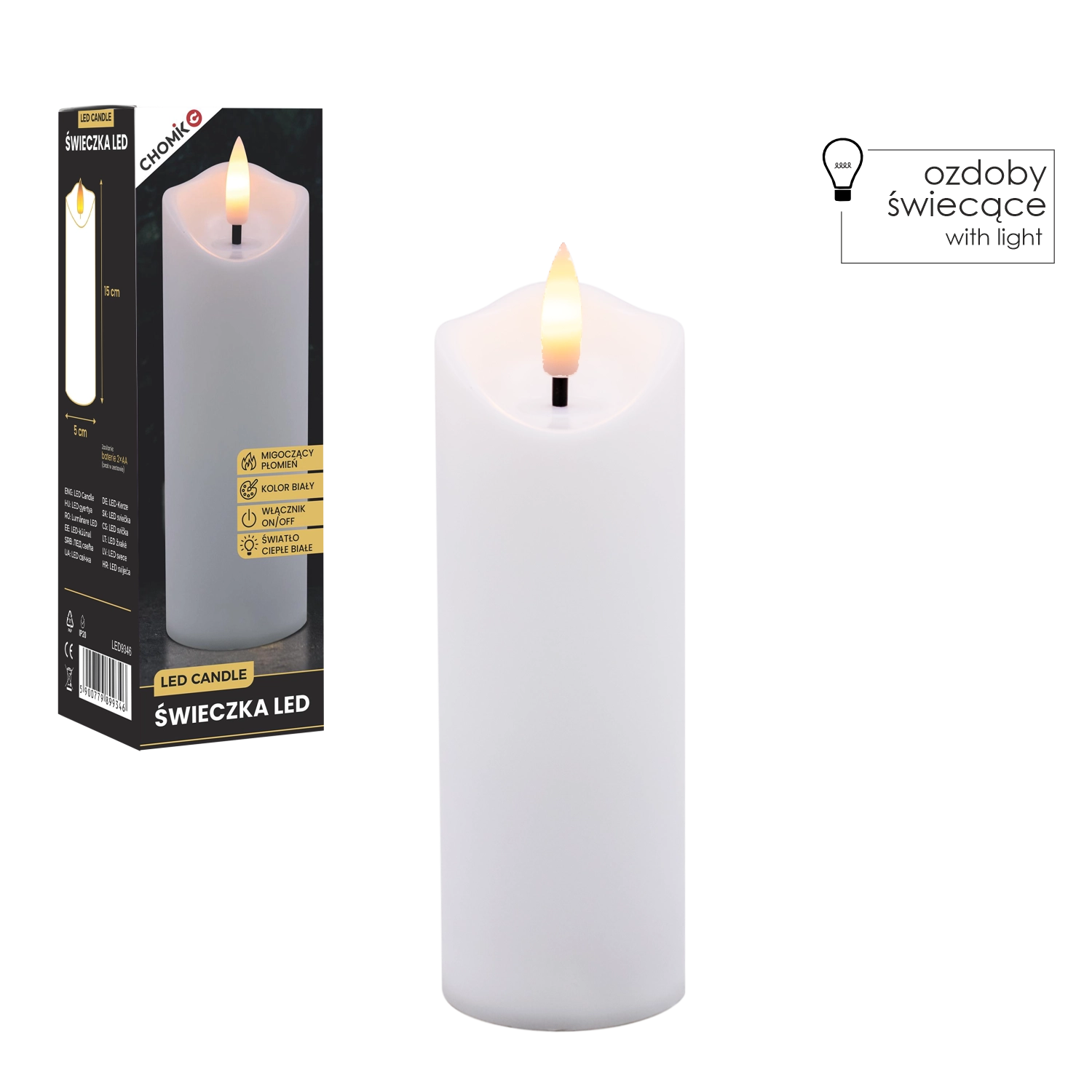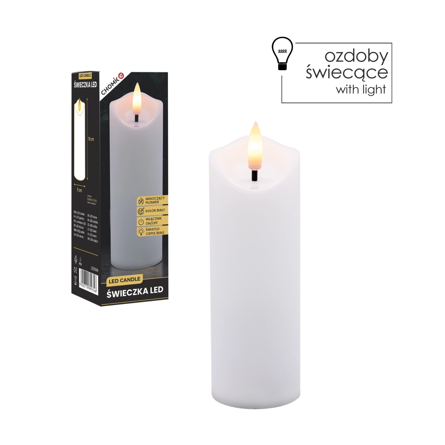 Varna in praktična LED sveča v elegantni beli barvi oddaja prijetno toplo svetlobo z učinkom pravega plamena. Idealna za dnevno sobo, spalnico ali kot diskretna svetlobna dekoracija na mizi ali polici. Uporabite jo lahko tudi kot zamenjavo za klasični vložek v lampijonu/svetilki.
