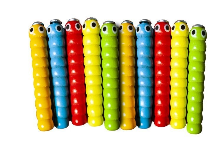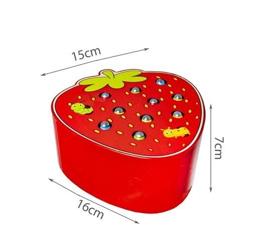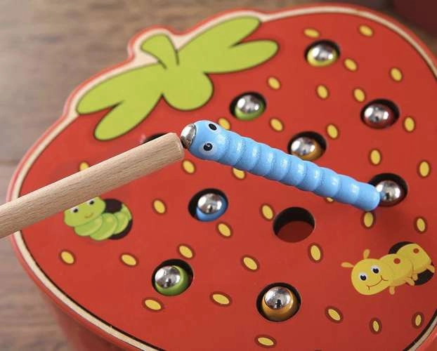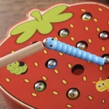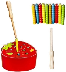 - Celovit komplet: lesena jagoda, magnetna palčka in 10 črvov/gosenic