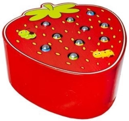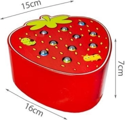 Zabavna lesena igra v obliki slastne jagode razvija fino motoriko in zbranost. Otroci s pomočjo magnetne palčke izvlečejo in vstavljajo črve v odprtine. Igra je iz varnih materialov in ima žive barve, ki otroke spodbujajo k igri in učenju. Odlična izbira za razvoj koordinacije oko–roka, ustvarjalnosti in potrpežljivosti.