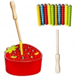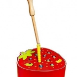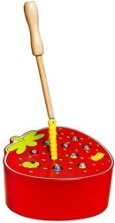 Ujemi črva! Ta prisrčna lesena igra v obliki jagode bo otroke zabavala dolge trenutke. Z magnetno palčko izvlečejo črve iz odprtin in jih znova vstavljajo nazaj, s čimer urijo fino motoriko, natančnost in zbranost. Naravne lastnosti lesa dopolnjujejo trpežna izdelava ter varni, gladki robovi.