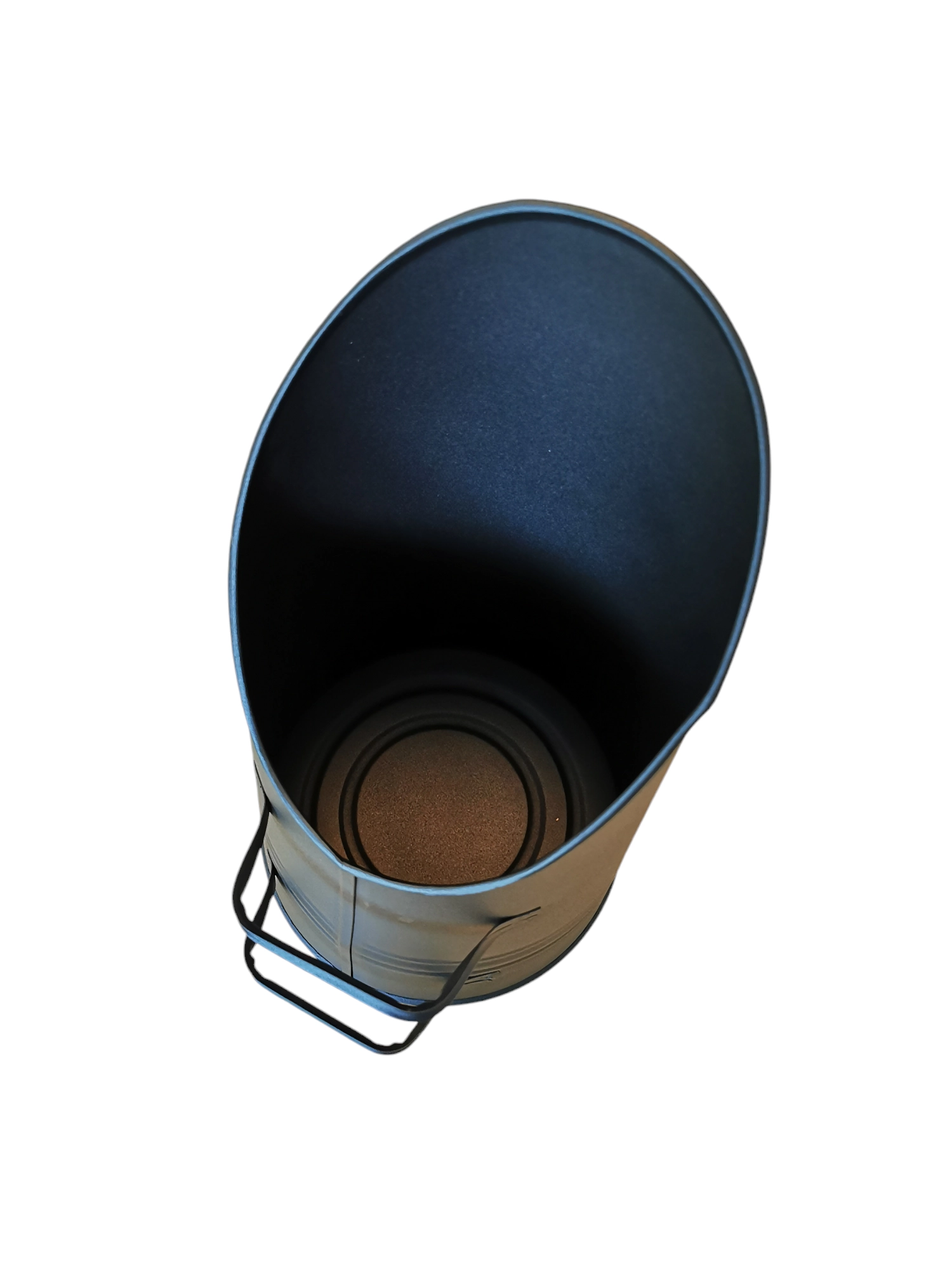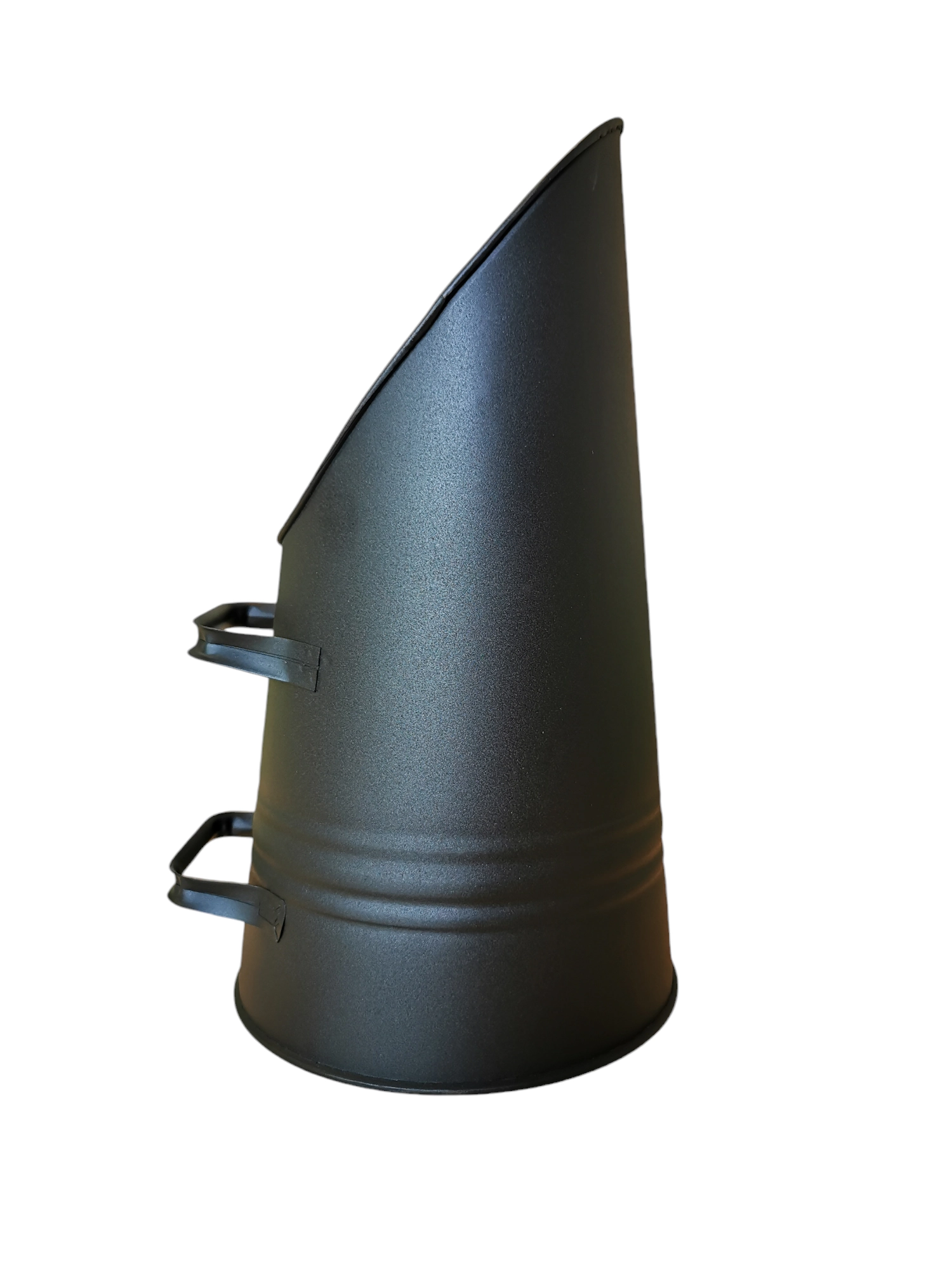 Robustno kovinsko vedro za premog v črni barvi je idealno za kamine, peči in kotle. Stožčasto telo z nagnjenim lijakom omogoča natančno in čisto izpraznjevanje goriva ali pepela, medtem ko čvrsti ročaji zagotavljajo zanesljiv oprijem in enostavno prenašanje.