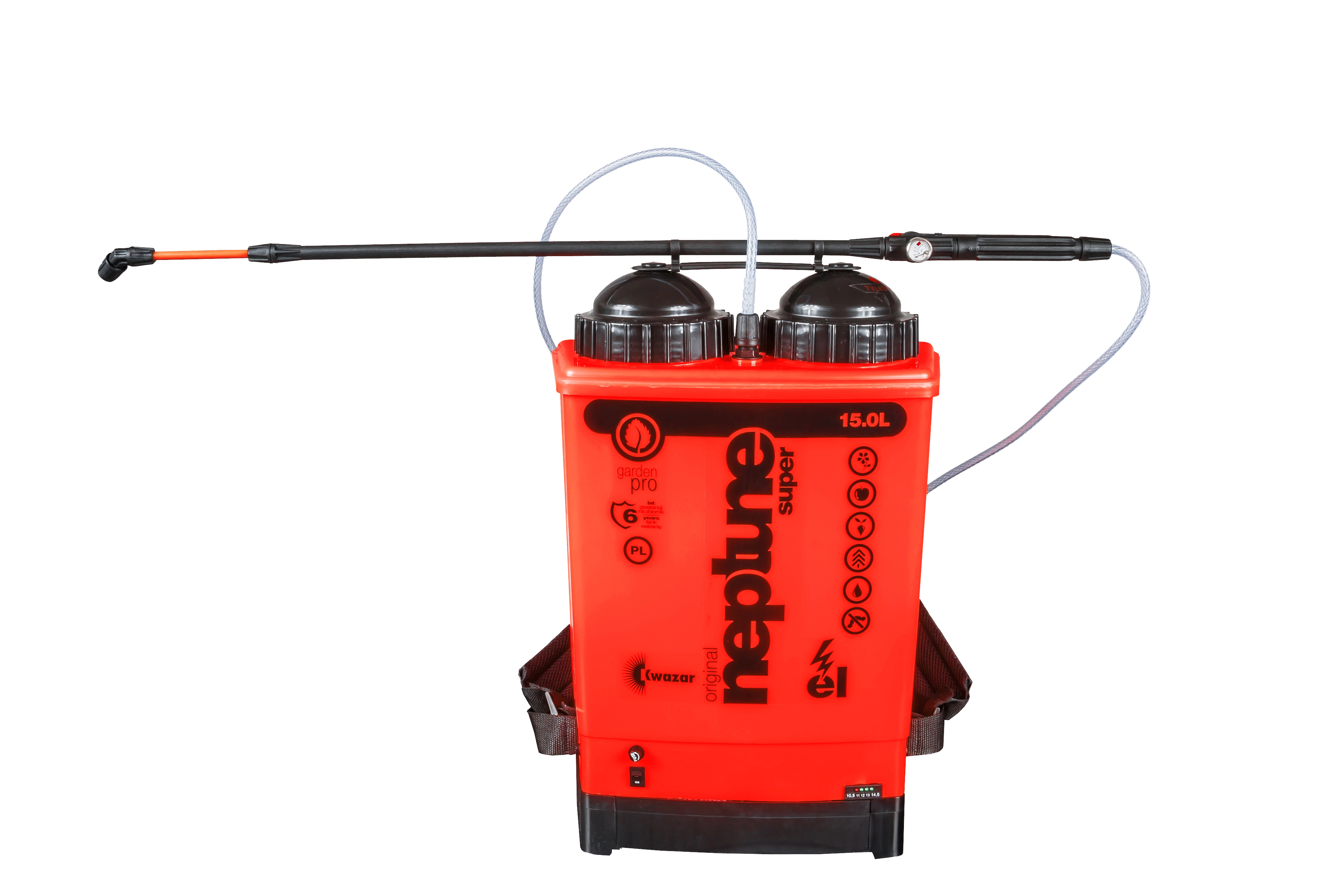 NEPTUN GARDEN 15 l je profesionalna nahrbtna škropilnica, ki jo poganja 12V gel akumulator in zagotavlja enakomerno ter natančno škropljenje brez napora. Ločen tlačni rezervoar v posodi ohranja stabilen tlak, medtem ko tristopenjska filtracija ščiti črpalko in šobe pred nečistočami. Merilno okno (vodoznak) na posodi omogoča natančno merjenje nivoja in količine škropilne tekočine.