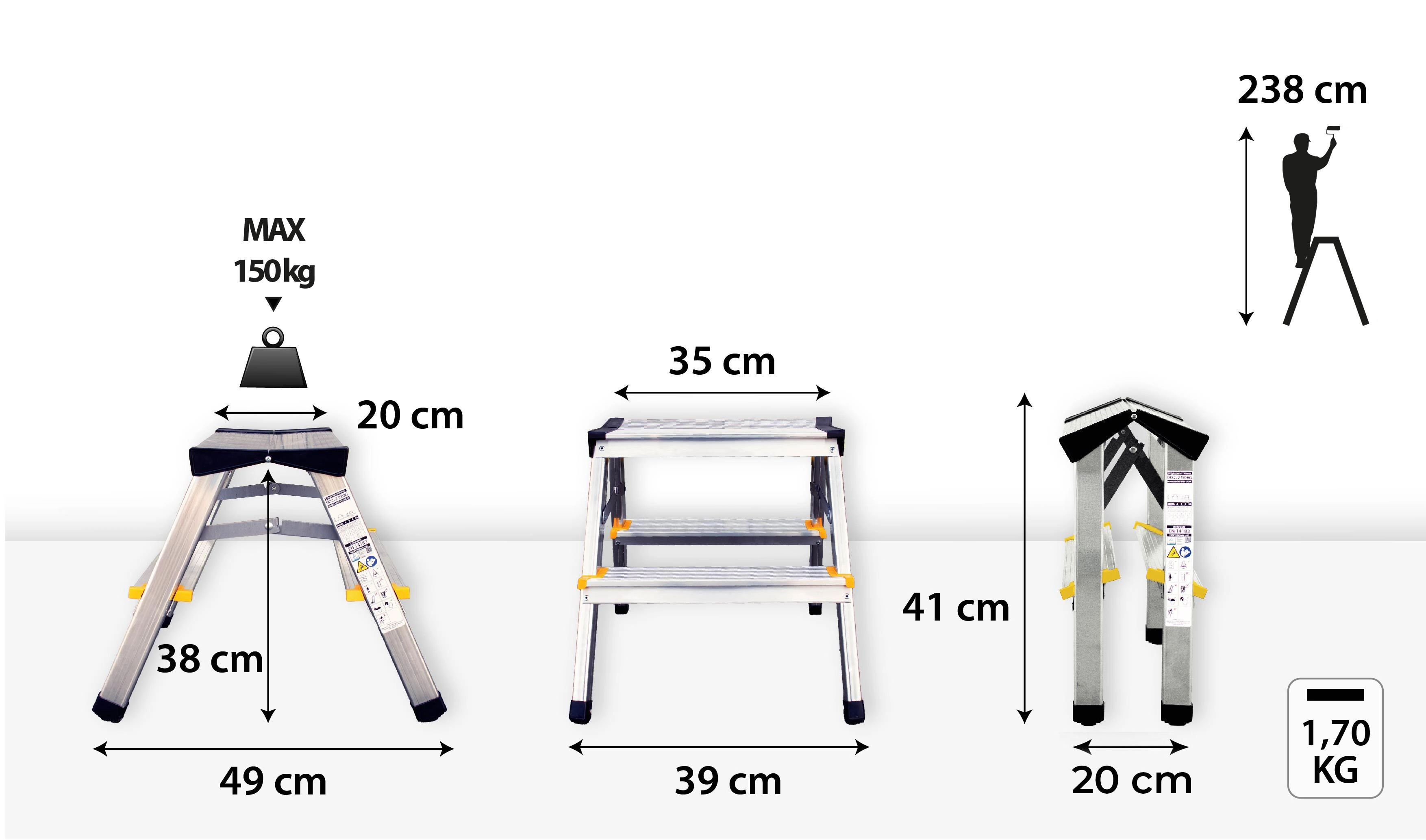 Stabilnost zagotavljajo ojačane prečne vezi, protizdrsni zaključki nožic in varnostni tečaj, ki preprečuje prekomerno razpiranje. Stopnice se hitro zložijo v kompaktno obliko za enostavno prenašanje in shranjevanje. Zahvaljujoč certifikatu TÜV Rheinland in skladnosti z EN 14183 izpolnjujejo zahtevne varnostne standarde.