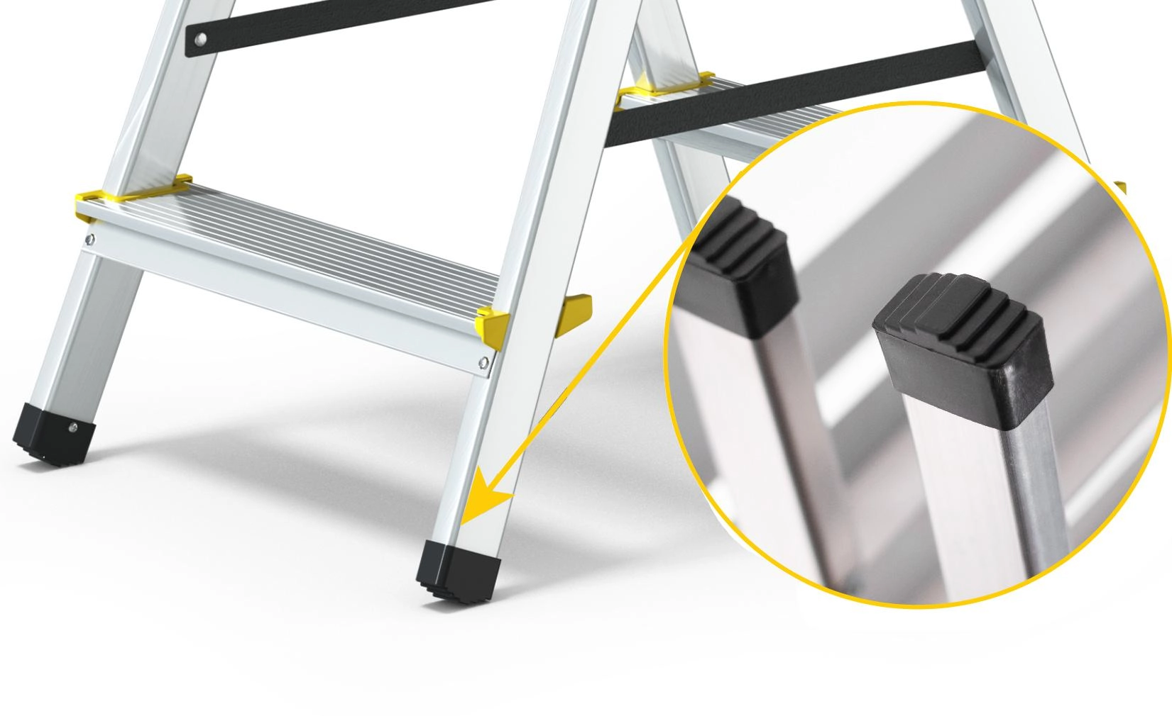 Široke rebraste stopnice z zaščitnimi pokrovi ter gumijasti zaključki nožic zagotavljajo stabilno in varno stanje na katerikoli podlagi.