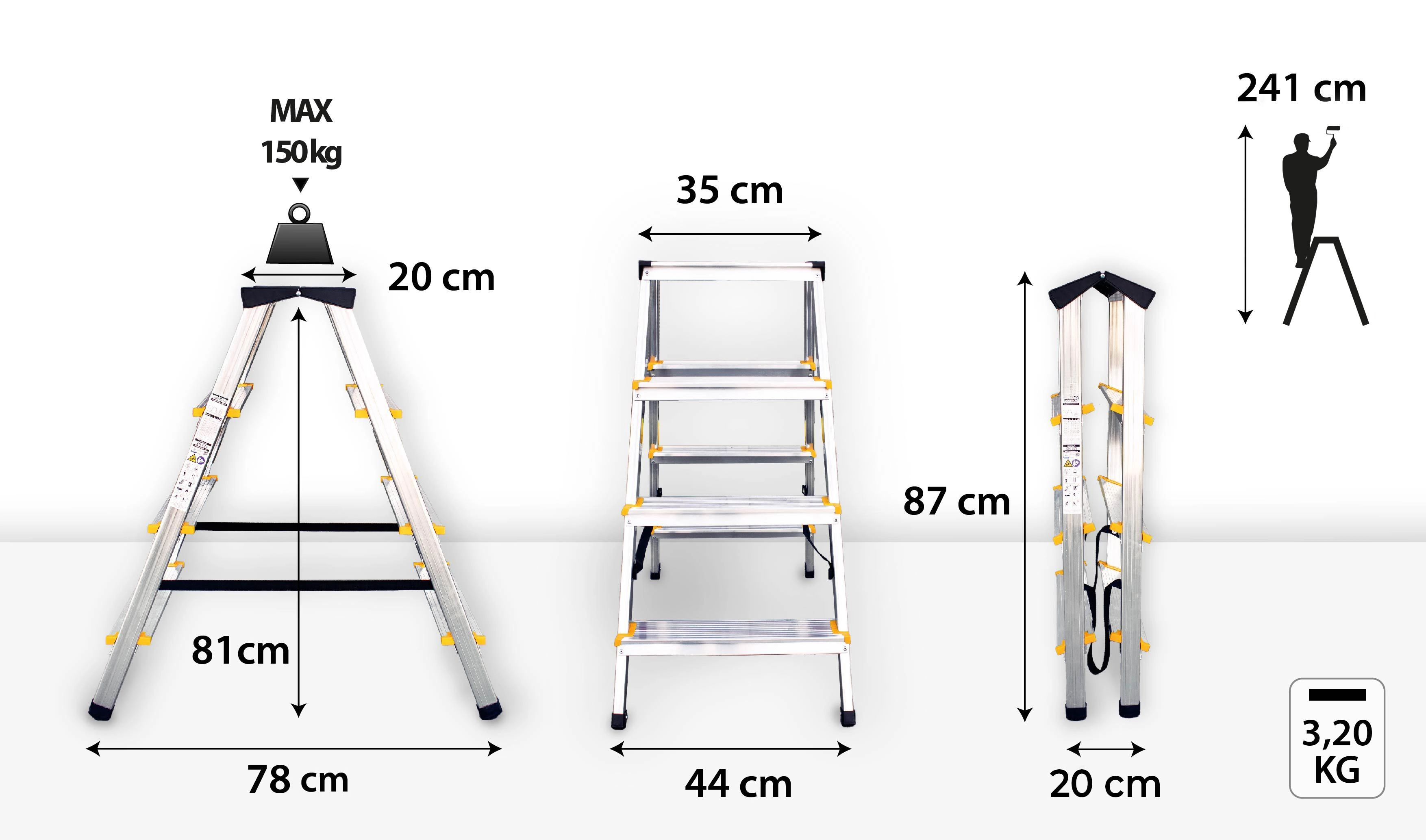 Lahak, a trden aluminij s plastičnimi zaščitami na stopnicah zagotavlja dolgo življenjsko dobo in enostavno rokovanje brez odvečne napora.
