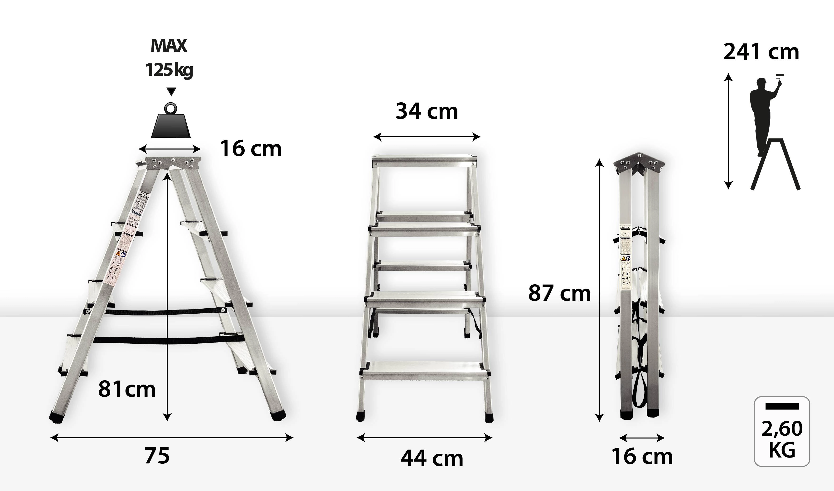 Robustna izdelava z nosilnostjo 125 kg nudi varno oporo za delo na višini, ne glede na to, ali barvate, segate do višjih polic ali izvajate drobna vzdrževalna dela. Zaradi kompaktnih mer so stopnice enostavne za shranjevanje in zavzamejo malo prostora.