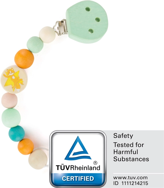 Praktičen in stilski spon za dudo iz naravnega lesa drži dudo vedno pri roki in čisto. Je odporen na slino, izdelan iz varnih, nestrupenih materialov, barvite perle in oblike pa spodbujajo razvoj fine motorike že od rojstva.