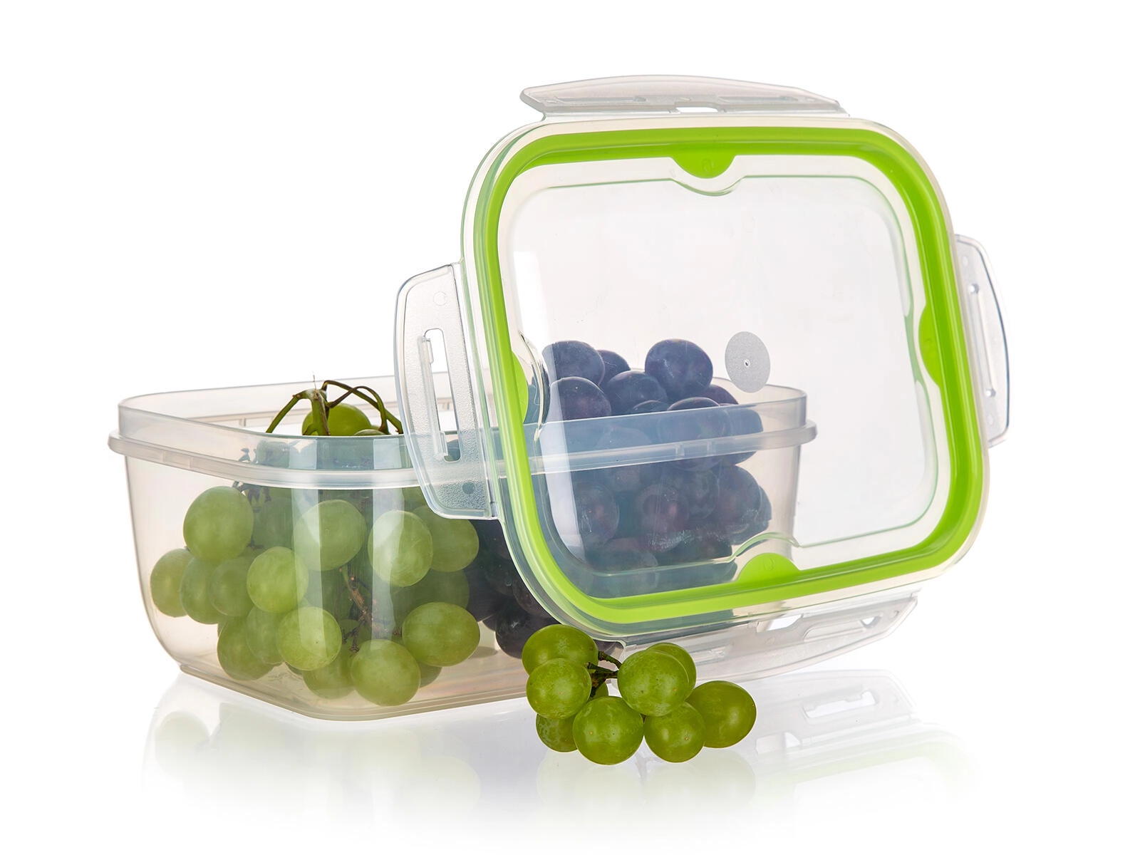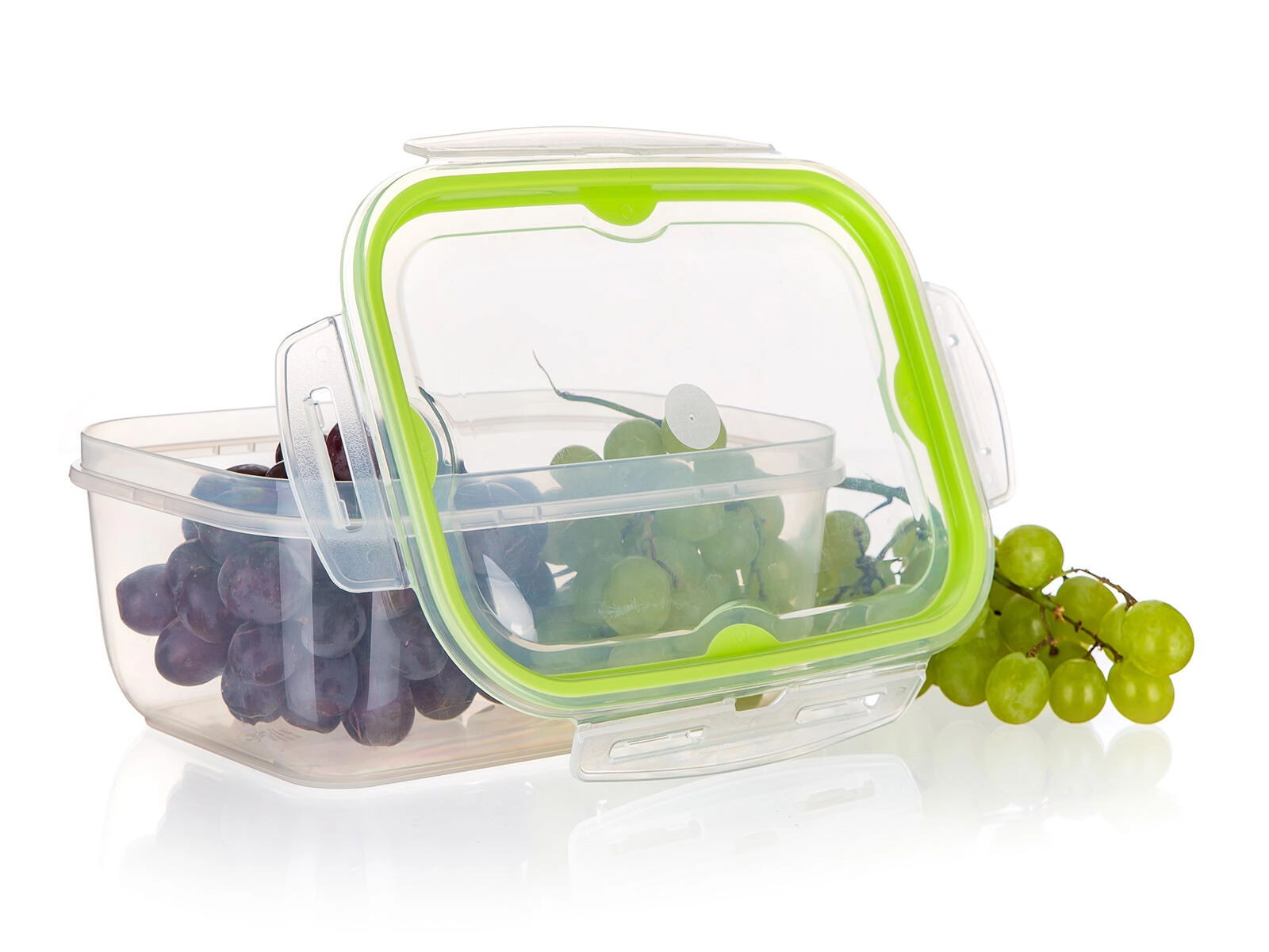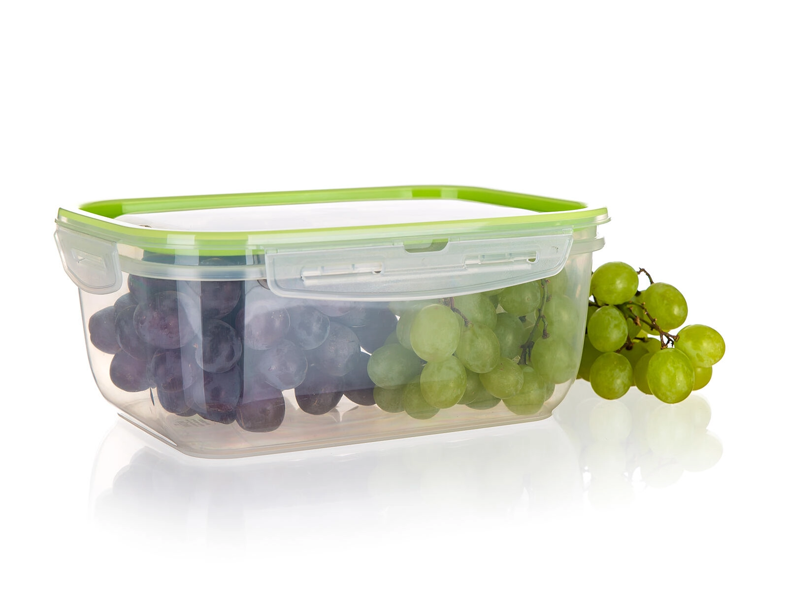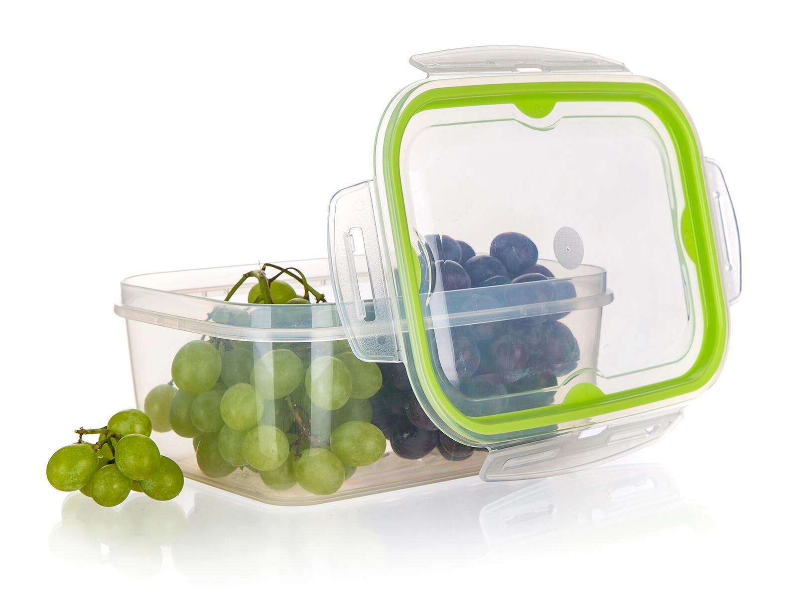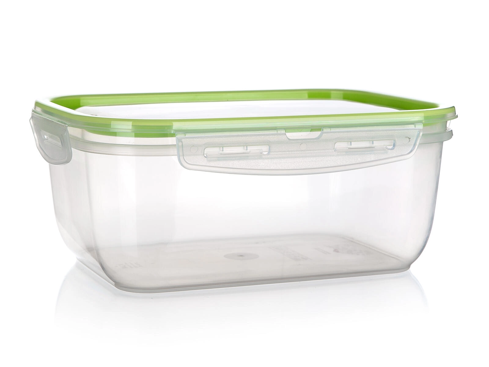 Zahvaljujoč prozornemu ohišju vedno vidite, kaj je v notranjosti, pravokotna oblika pa omogoča zlaganje in prihranek prostora v hladilniku in zamrzovalniku. Posoda je izdelana iz trpežne plastike, primerne za vsakodnevno uporabo, ter je na voljo z barvnim tesnilom (zelena, turkizna, rdeča, črna), da se ujema z vašo kuhinjo.