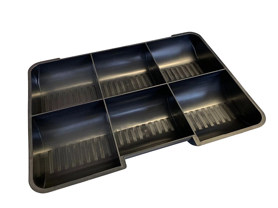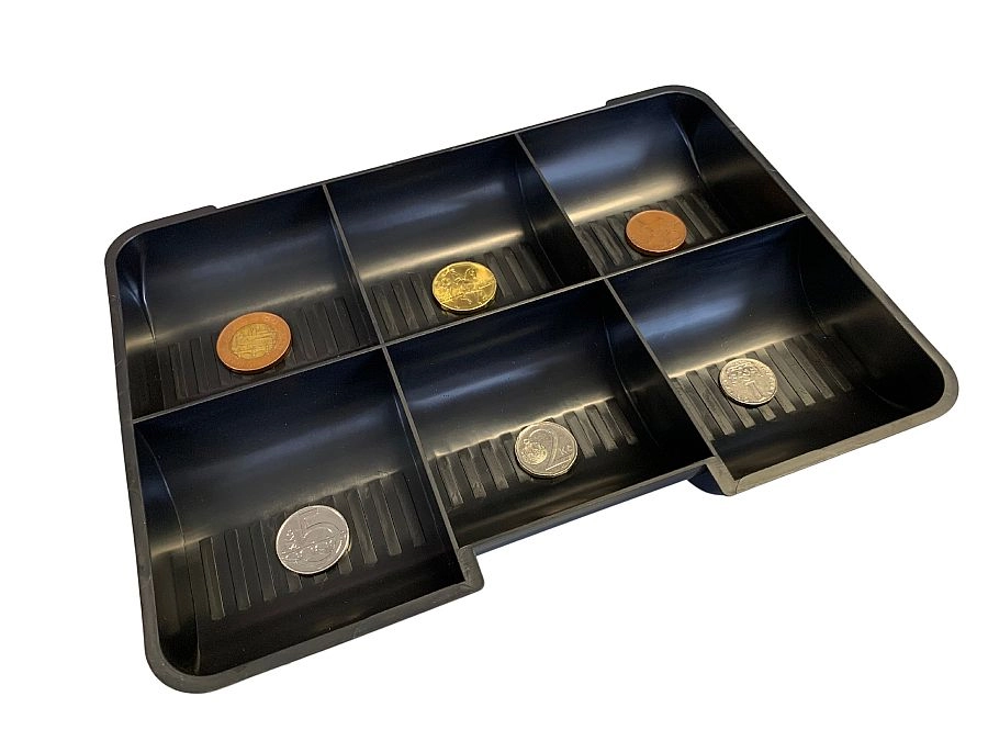 Odstranljiv vložek za kovance s preglednimi razdelki omogoča hitro razvrščanje in enostaven dostop do kovancev pri vračilu gotovine.