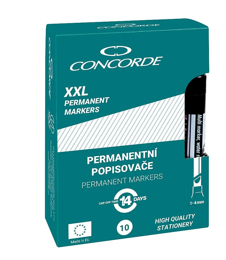 Univerzalen permanentni označevalnik CONCORDE z neprosojnim črnilom na osnovi alkohola za zanesljivo označevanje na folijah, steklu, plastiki, lesu in kovini. Ponuja neizbrisljiv in vodoodporen zapis, okrogla konica 3 mm ter izjemno obstojnost – do 14 dni brez pokrovčka brez izsušitve.