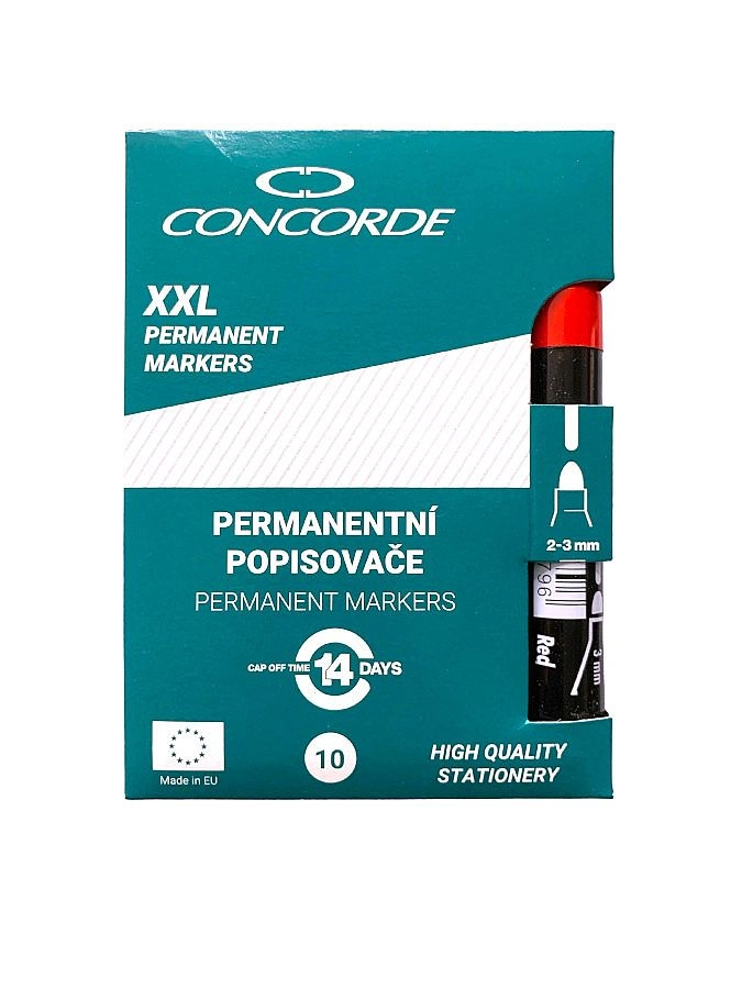 Univerzalni permanentni označevalnik CONCORDE z okroglo konico in širino sledi 3 mm je idealen za označevanje stekla, folij, plastike, lesa in kovine. Neizbrisen, vodoodporen in z neprosojnim črnilom na osnovi alkohola. Zahvaljujoč posebni formuli zdrži do 14 dni brez pokrovčka brez izsušitve.