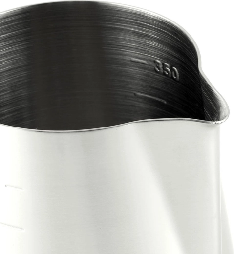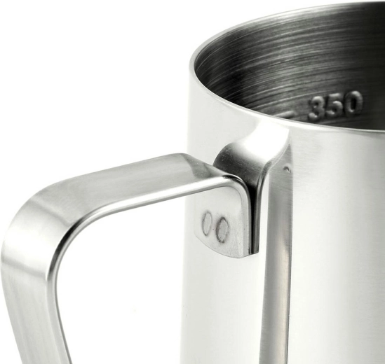 Praktičen jeklen vrček za penjenje mleka. Udoben ročaj in izliv olajšata dolivanje. Praktična merilna skala z notranjim označevanjem na 50 ml. Čvrsta jeklena konstrukcija zagotavlja dolgo in brezskrbno uporabo.
