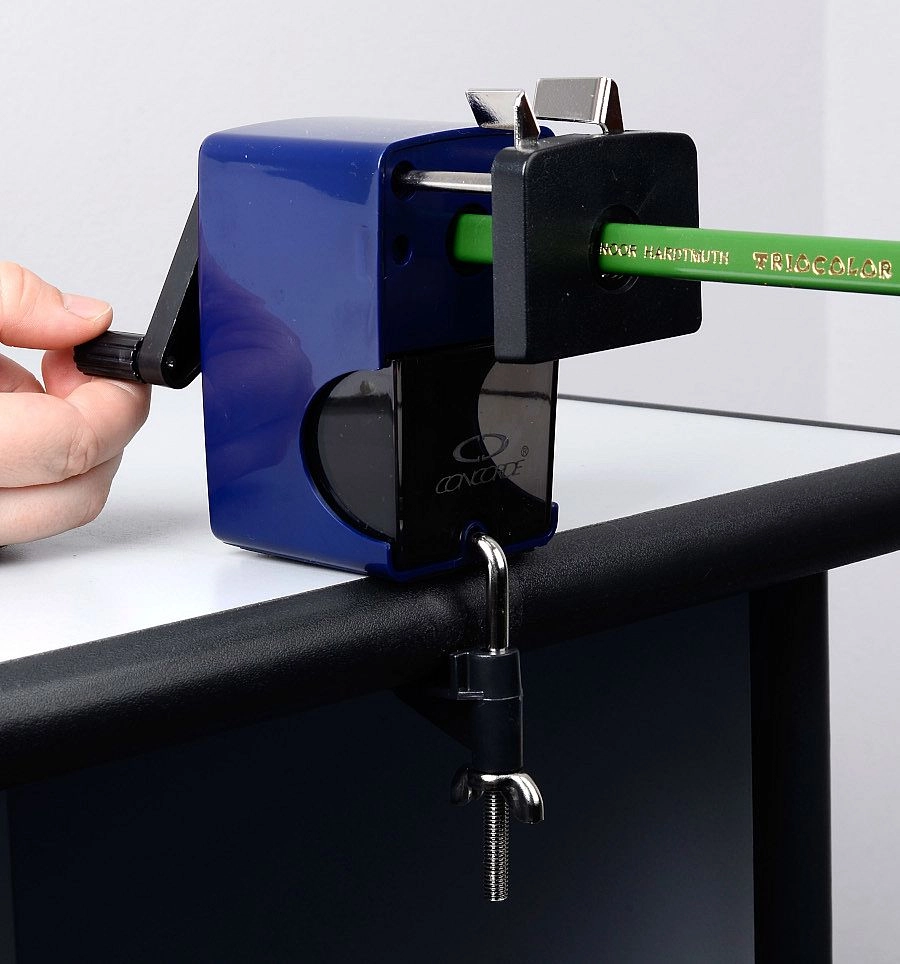 Praktičen mehanizem za iztiskanje zlomljene mine prihrani čas in živce – zataknjeno mino preprosto sprostite s priloženim trnom. Šilček je mogoče čvrsto pritrditi na rob mize, kar povečuje stabilnost in varnost pri uporabi, zlasti pri šiljenju debelejših barvic.