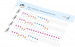 Priloženi barvno označeni notni listi (npr. »Old MacDonald«) pomagajo otrokom povezovati barve s toni in hitro osvojiti prve melodije.