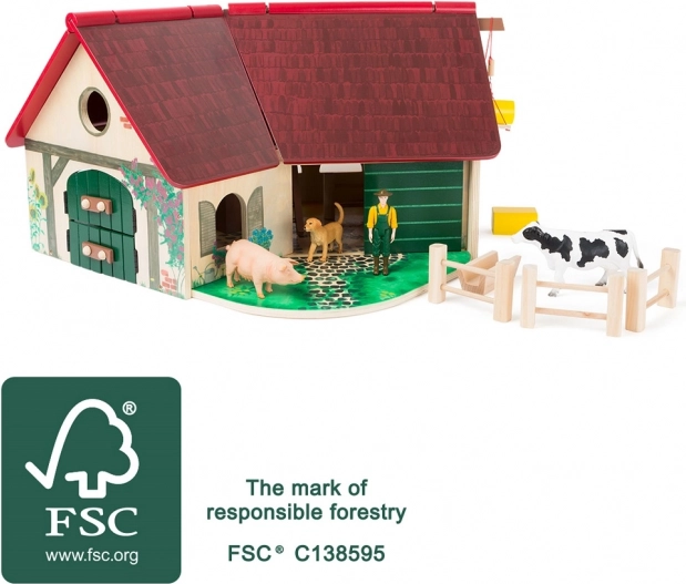 Kmetija je izdelana iz 100 % FSC certificiranega lesa, ki je okolju prijazen in varen za otroke. Ta les izvira iz gozdov, ki so upravljani tako, da varujejo naš planet.