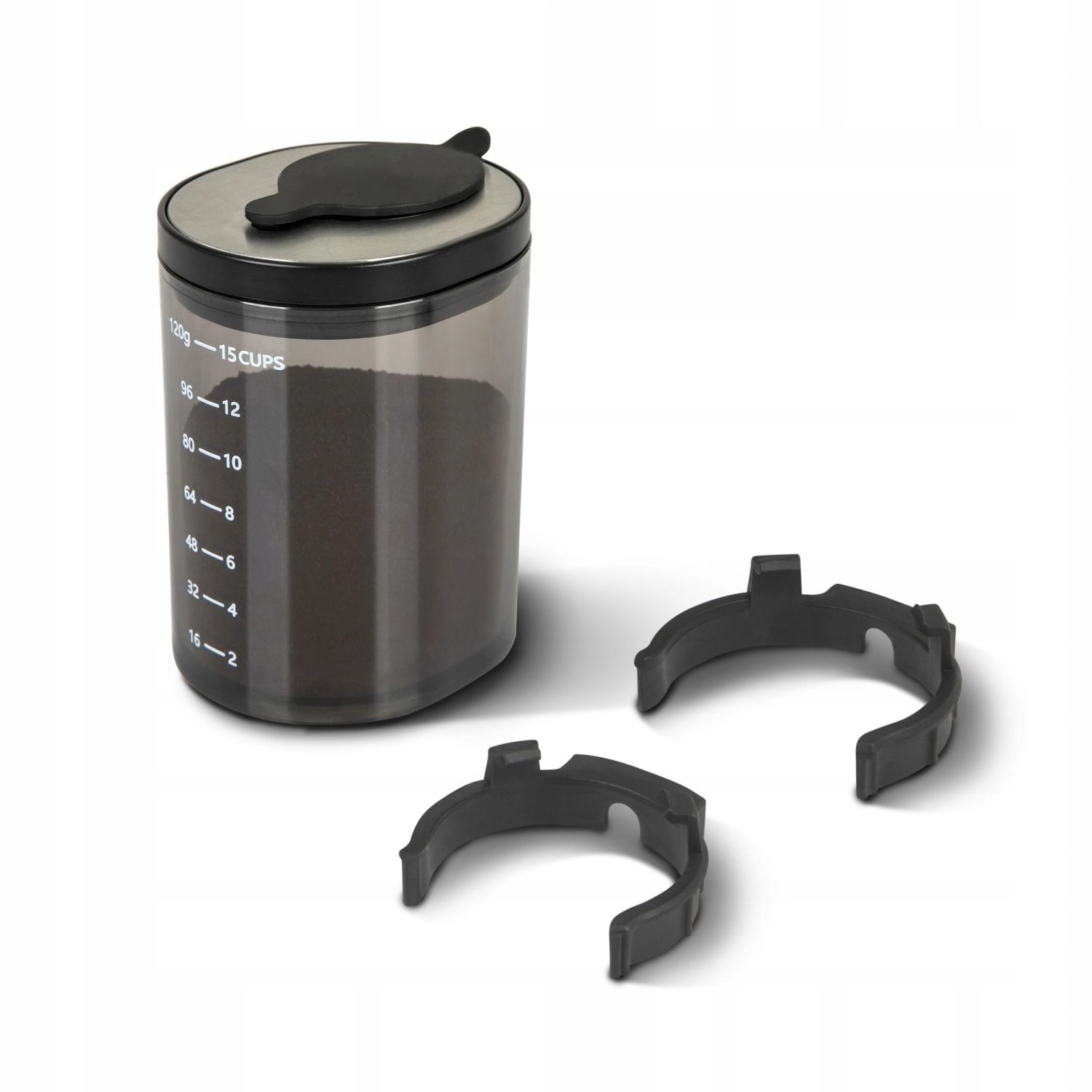 V kompletu je zapiralna posodica za mleto kavo z merami ter adapterji za različne portafilterje – vse za enostavno odmerjanje in ohranjanje svežine.