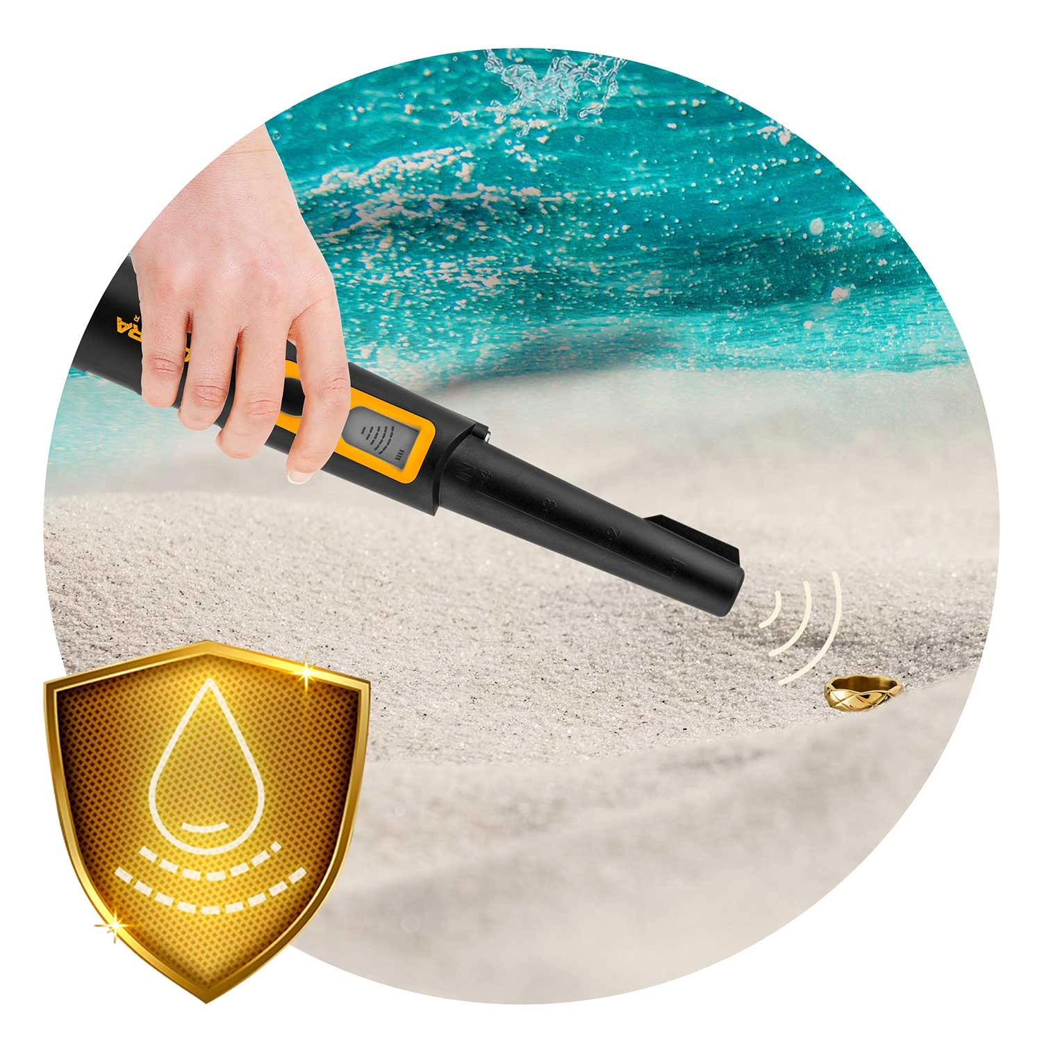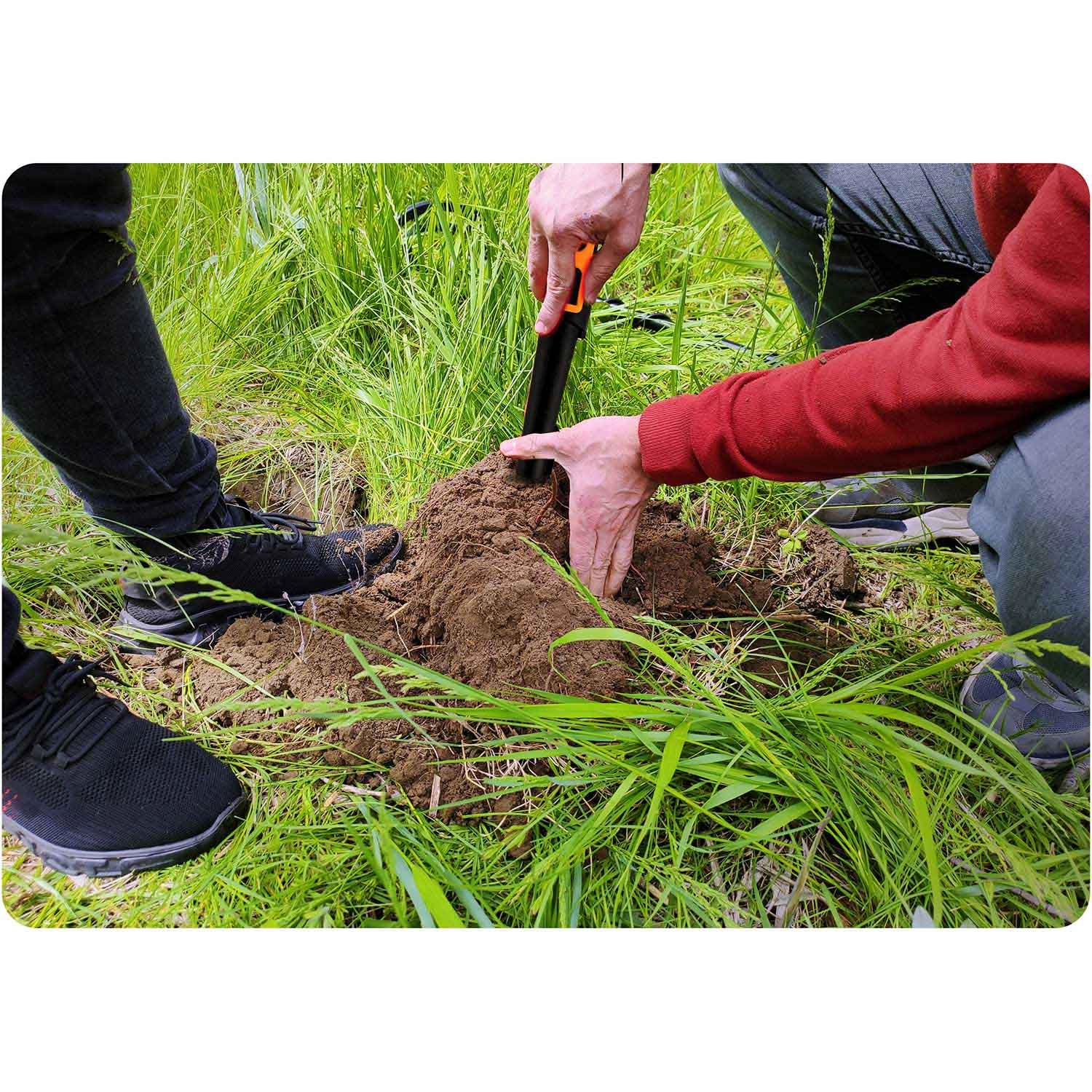 Detektor je vodotesen po IPX8, zato lahko delate v mokri zemlji in v vodi. Vgrajena LED svetilka olajša iskanje v temi, gumiran ročaj pa zagotavlja zanesljiv oprijem tudi v zahtevnih razmerah. Napajanje z običajno 9 V baterijo (ni priložena) in samodejno umerjanje poenostavljata uporabo doma in na terenu.