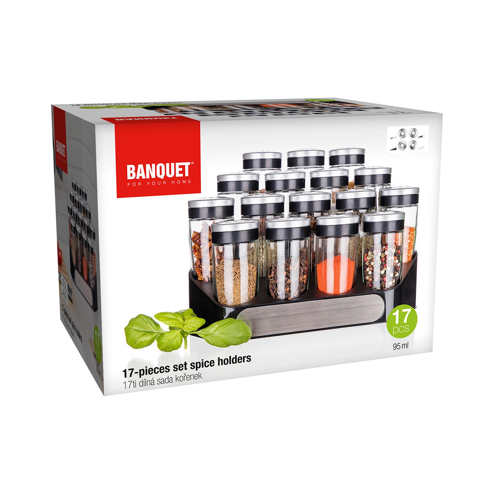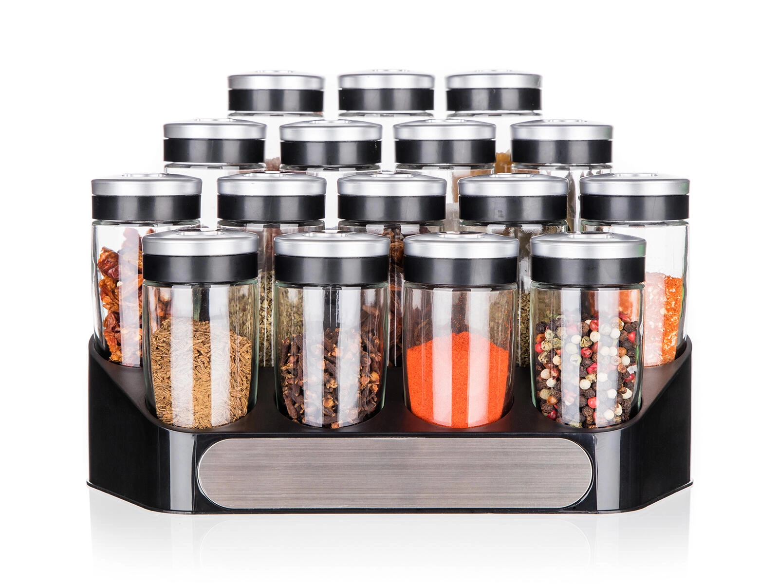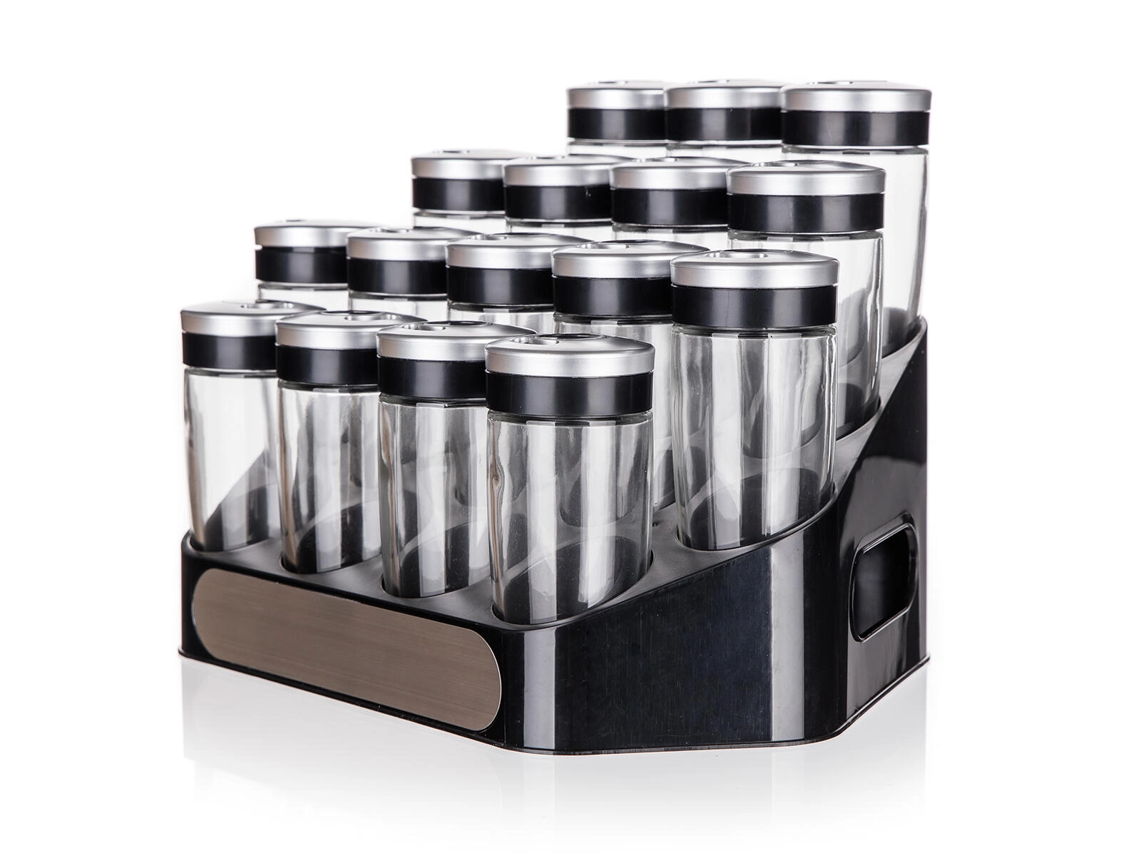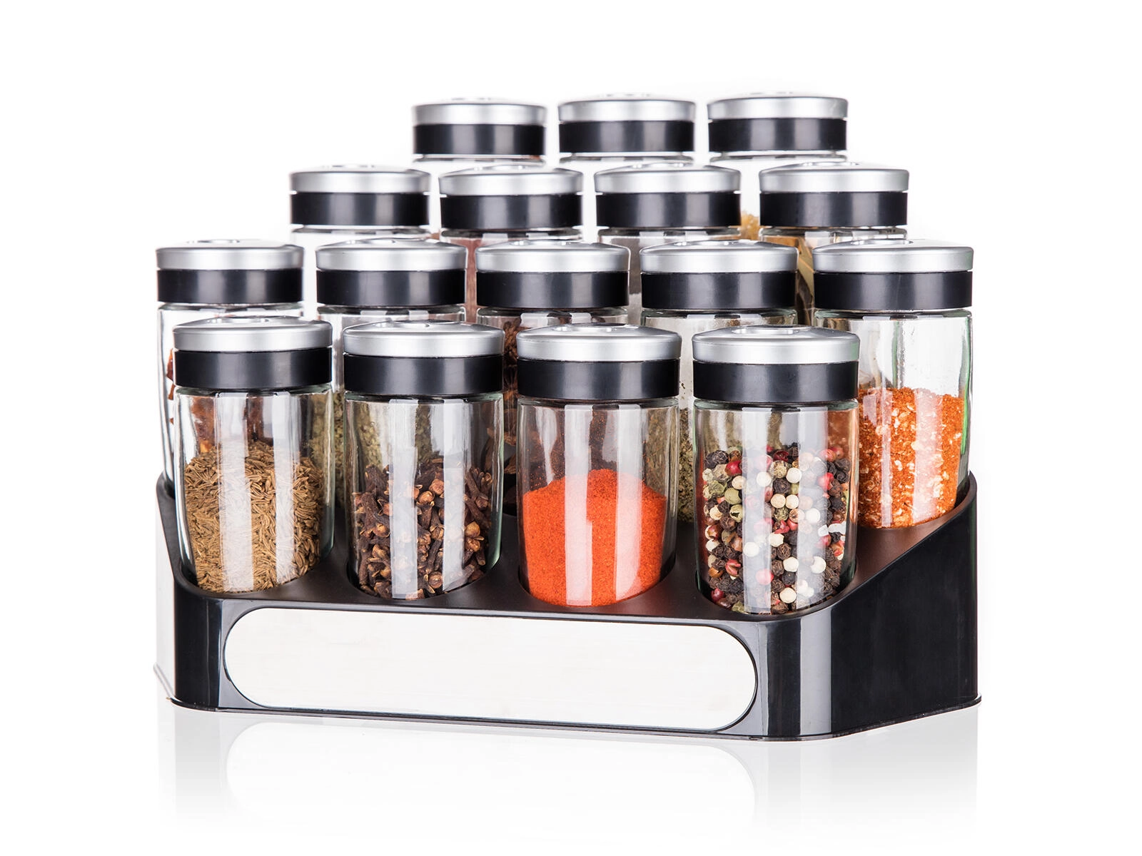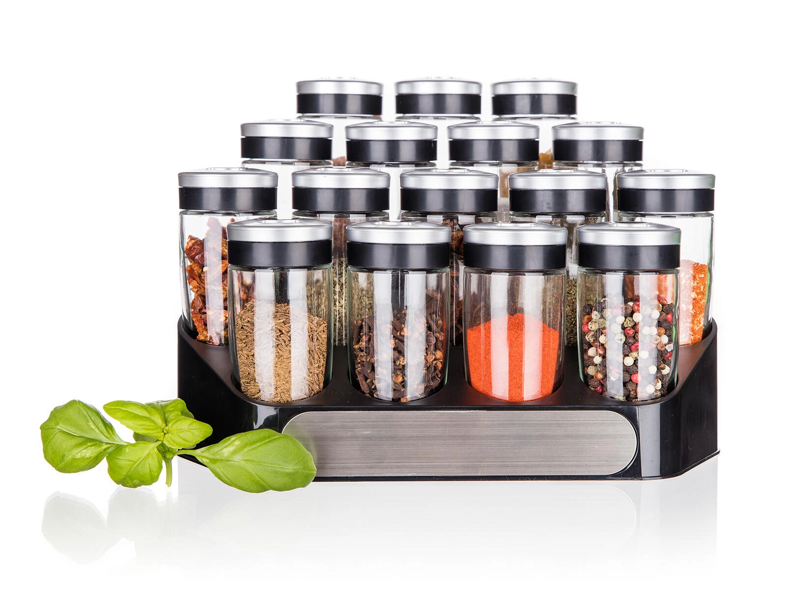 Stabilno stojalo iz ABS plastike urejeno hrani vseh 16 posodic pri roki – idealno za kuhinjski pult ali shrambo.