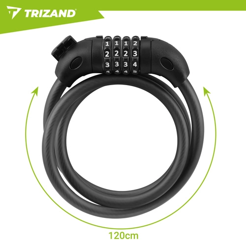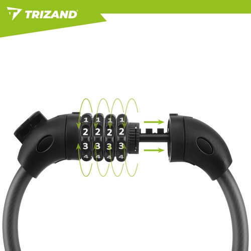 Kolesarska ključavnica TRIZAND je praktična in vsestranska zaščita za mestna kolesa, gorska kolesa (MTB), skiroje ali otroške vozičke. Ponastavljiva štirimestna koda prinaša udobje brez ključev in gladek mehanizem za hitro uporabo. Močna jeklenica 13,5 mm s prožnim navitjem se zlahka ovije okoli okvirja in trdnega predmeta, ne da bi poškodovala lak zahvaljujoč zaščitnemu plašču.
