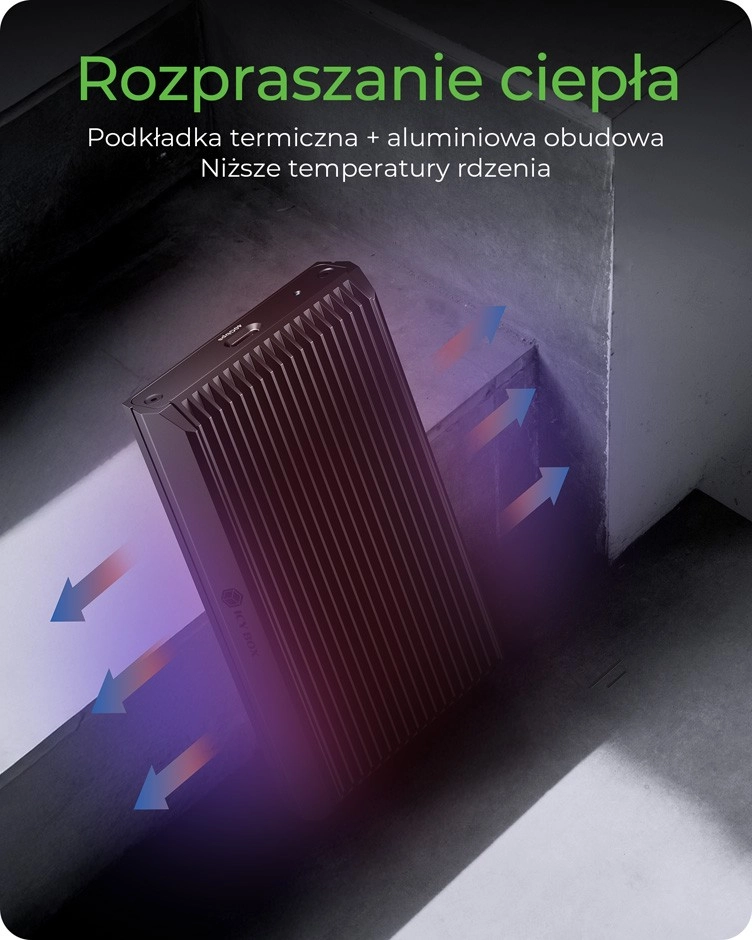 Robustno aluminijasto ohišje učinkovito ščiti disk pred udarci in obrabo ter skupaj z vgrajeno termično blazinico odvaja toploto neposredno v ohišje. Tako SSD ostane hladen in ne prihaja do znižanja zmogljivosti pri dolgotrajni obremenitvi. Namestitev je popolnoma brez orodja – izvlecite, vstavite SSD, dodajte blazinico in zaprite.