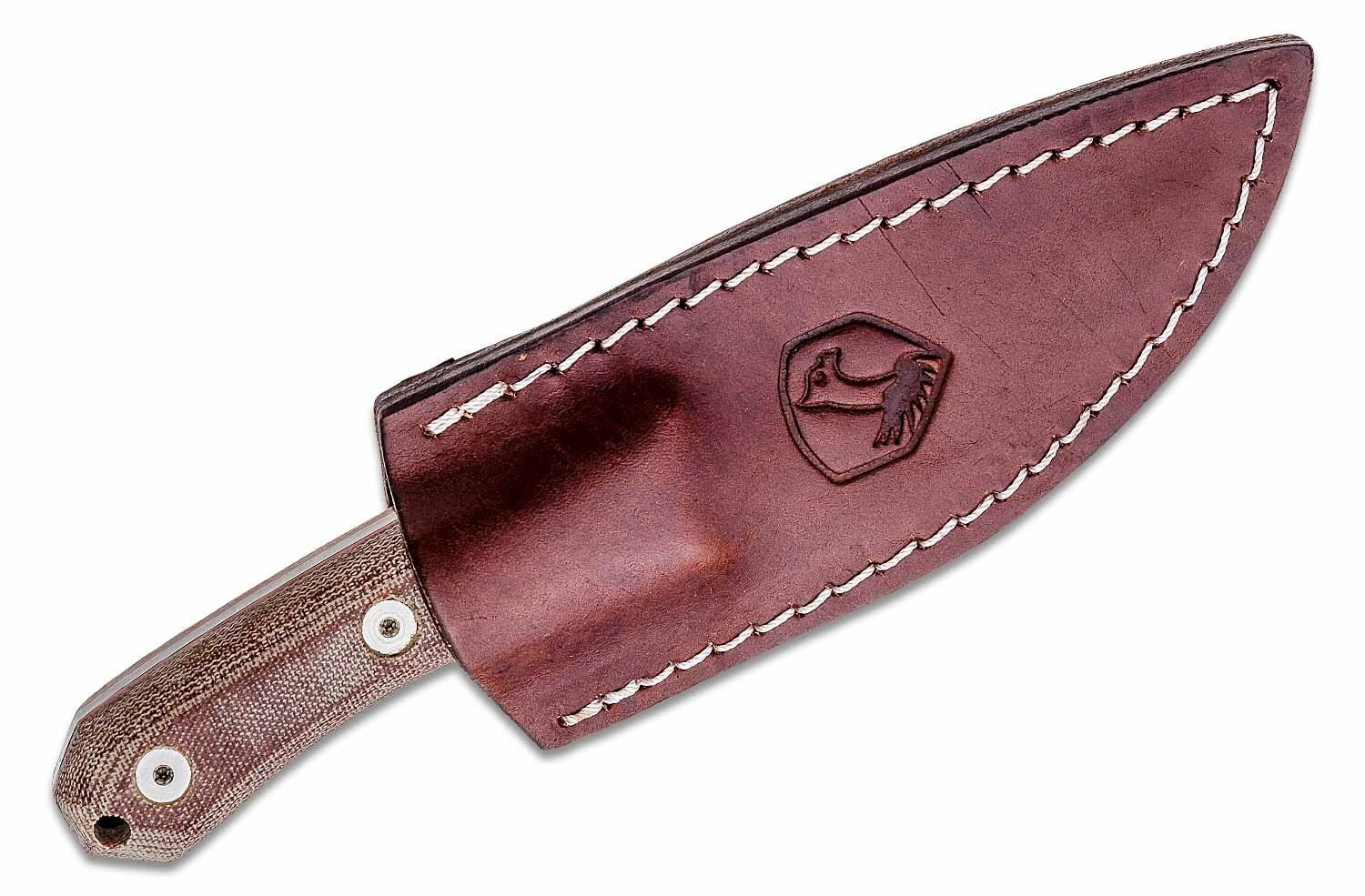 Ergonomski ročaj iz Micarte v rjavem odtenku Tan ima bolj grobo teksturo za zanesljiv oprijem v suhem in vlažnem okolju. Uho za vrvico razširja možnosti pritrditve ali obešanja. Del paketa je kakovostna usnjena nožnica za varno in udobno nošenje na pasu.