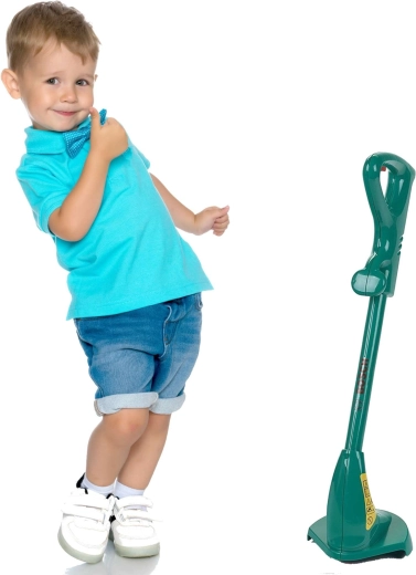 Zvest posnetek pravega strunastega obrezovalnika v značilni zasnovi BOSCH otroke spodbuja k igri malega vrtnarja.