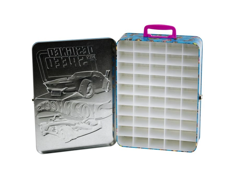 Praktičen kovinski kovček za 50 avtomobilčkov HOT WHEELS s preglednimi predelki, varno kovinsko zaponko in oranžnim ročajem za udobno in varno prenašanje. V notranjosti je prosojen plastični vložek za hiter pregled. Avtomobilčki niso priloženi.