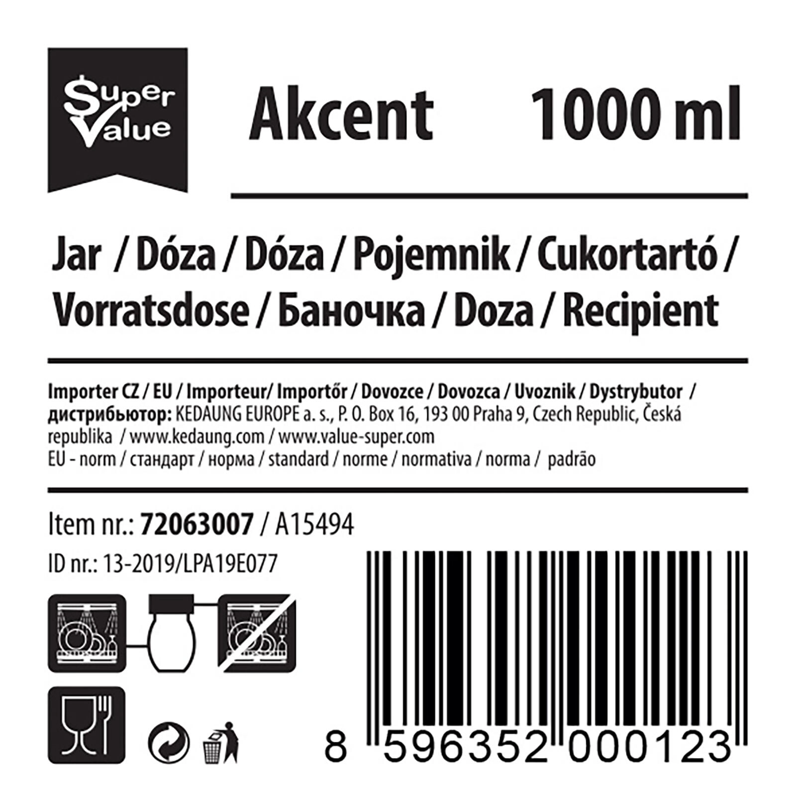 Praktična steklena doza AKCENT s prostornino 1 l in elegantnim nerjavnim pokrovom je idealna za vsakodnevno organizacijo kuhinje. Živila ohranja dlje sveža in pregledno shranjena. Primerna za začimbe, testenine, stročnice ali sladkor.