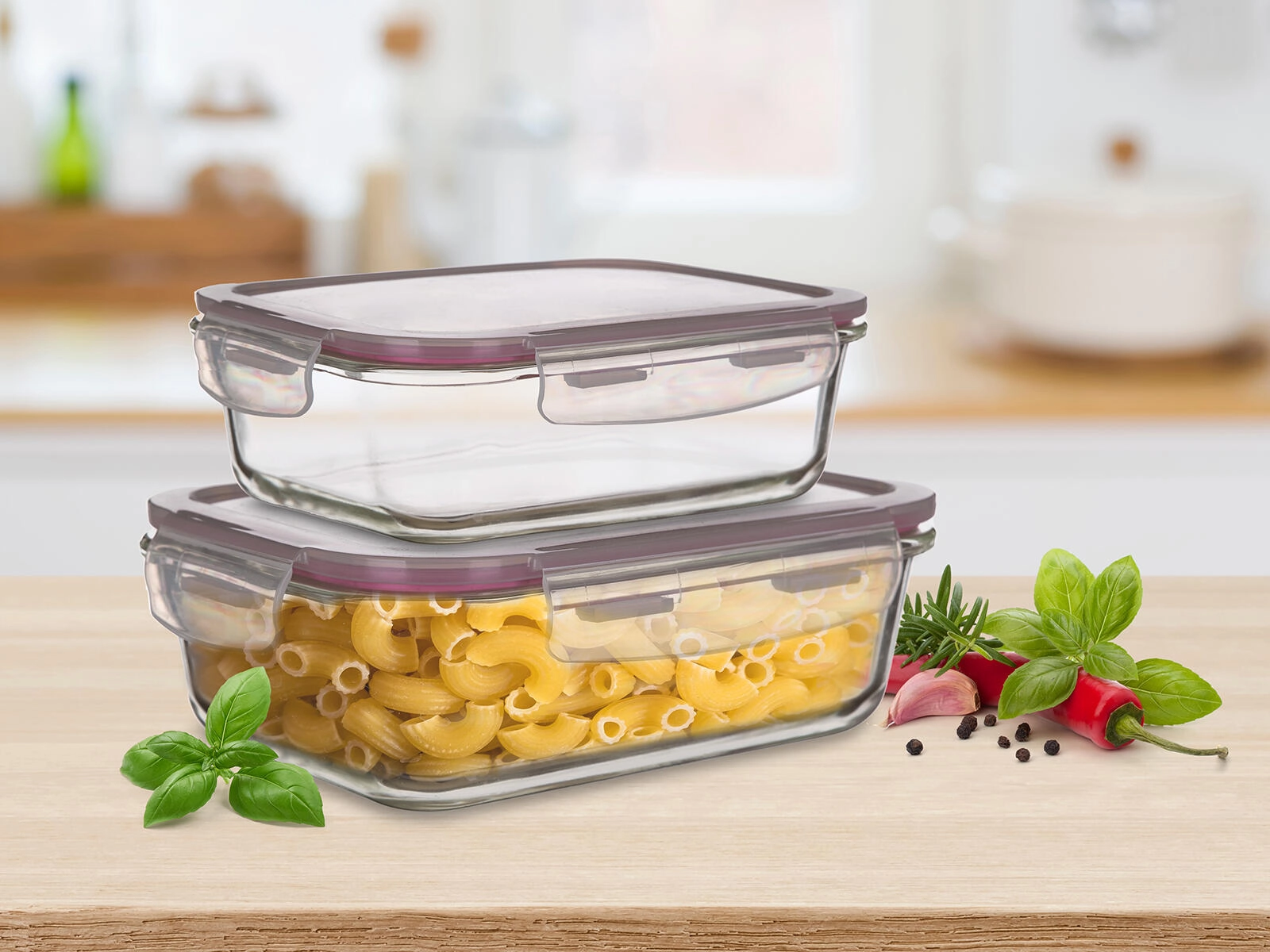 Praktičen komplet dveh pravokotnih steklenih posod Lora s prostornino 0,55 l in 0,95 l s polipropilenskimi pokrovi ponuja hermetično zapiranje, varno ohranjanje svežine in vsestransko uporabo v kuhinji. Primerno za peko v pečici (brez pokrova), pogrevanje v mikrovalovni pečici, zamrzovanje in prenašanje jedi. Pokrov je prozoren z bordo tesnilom za zanesljivo zapiranje.