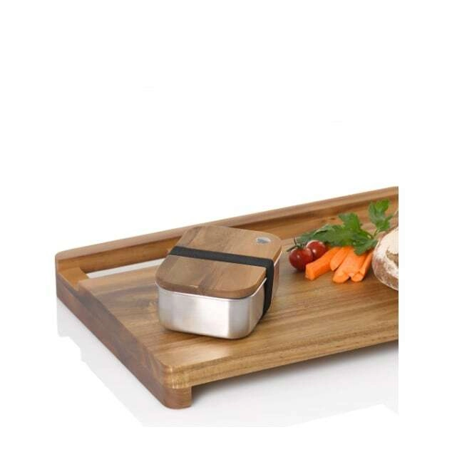 Odkrijte pametno povezavo priprave in shranjevanja. Prostorna deska iz akacije ponuja stabilno delovno površino za rezanje in serviranje, medtem ko integriran nerjaveč zaboj z lesenim pokrovom in elastičnim trakom varno hrani malico ali sestavine. Prostor za zaboj lahko hkrati služi kot varno mesto za shranjevanje nožev ali majhnih mlinčkov.