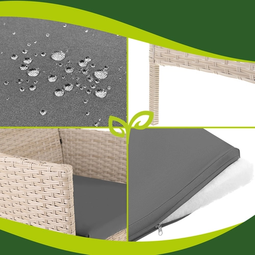 Ustvarite svojo sprostitveno oazo s časovno nevtralnim setom iz tehnoratana v bež barvi. Zahvaljujoč robustni konstrukciji iz pocinkanega jekla, prepletenega s tehnoratanom, ter odpornosti na vremenske vplive boste v udobju uživali skozi celo sezono. Mehke blazine debeline 5 cm v stilsko sivi barvi dopolnjuje klubska mizica s 5 mm stekleno ploščo za serviranje pijač in prigrizkov.