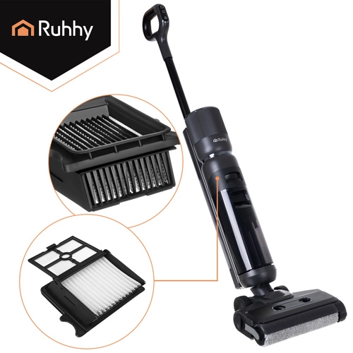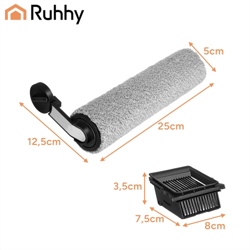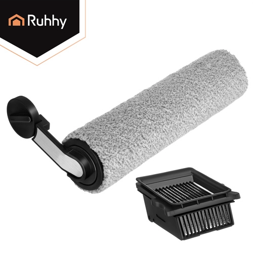 Nadomestni komplet Ruhhy vašemu pralnemu sesalniku vrne prvotno učinkovitost. Vrtljivi krtačni valjček učinkovito pobira suho in mokro umazanijo z gladkih tal in preprog, medtem ko HEPA filter razreda H9 zadržuje fin prah in alergene za čistejši dom.