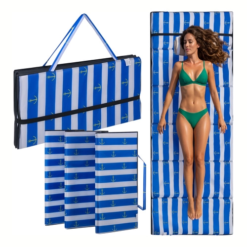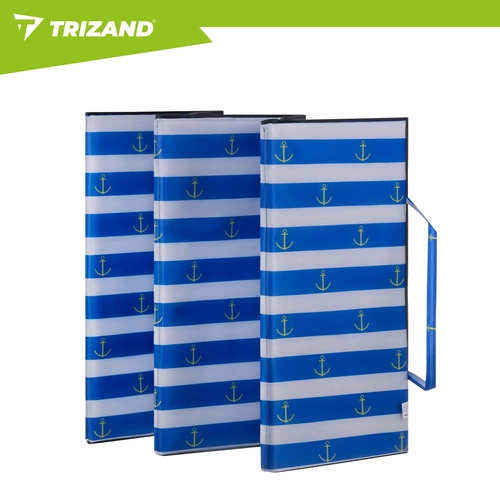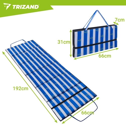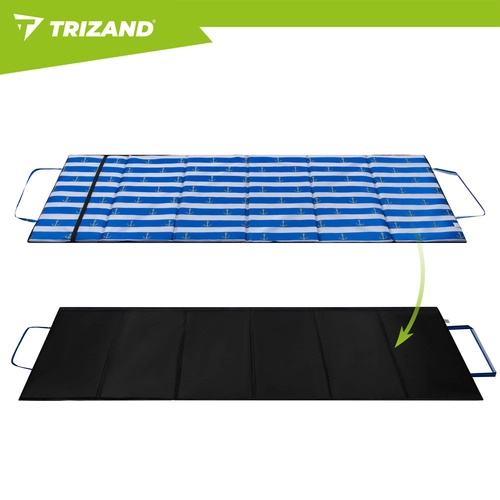 Uživajte v udobju tudi na kamniti plaži z podlogo TRIZAND z debelino 1 cm, vodoodporno izolacijo in zložljivo konstrukcijo. Lahka in praktična, z ročajem in elastiko za enostavno prenašanje – idealna za počitnice, k vodi in na izlete.