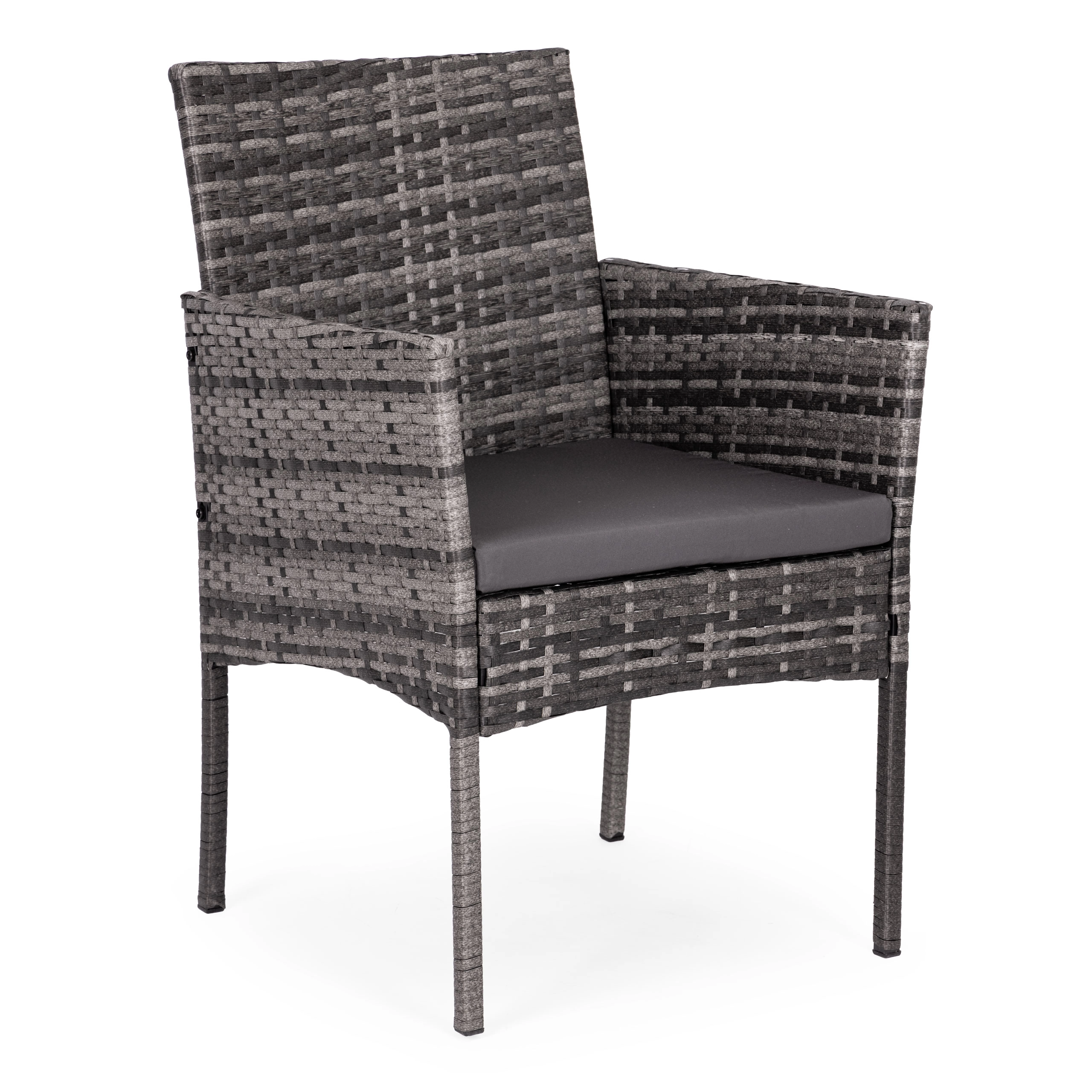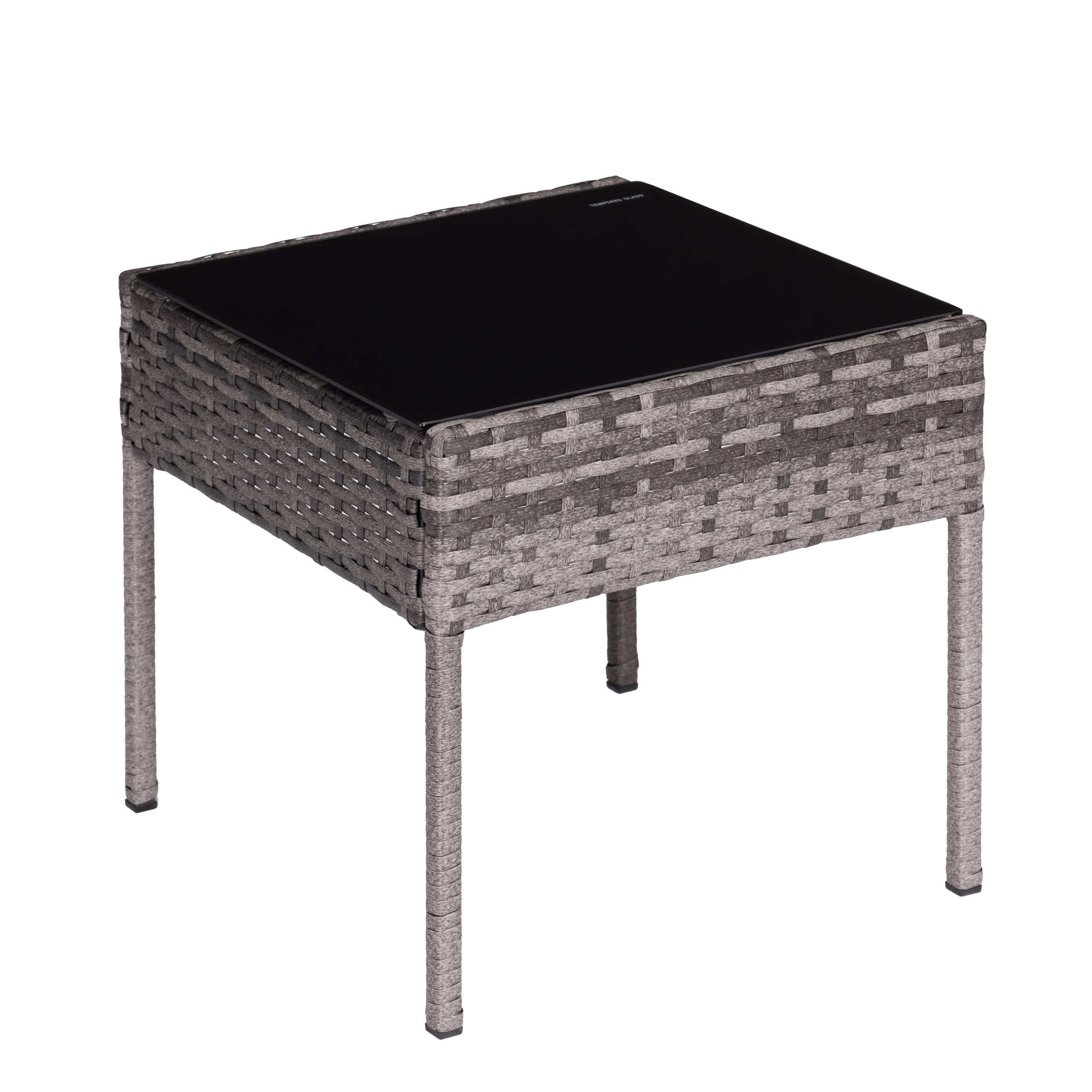 Kvadratna mizica z varno kaljeno ploščo (5 mm) je idealna za pijače in drobnarije, fotelje dopolnjujejo mehke blazine, odporne na UV in vlago. Nedrseči zaključki nog povečajo stabilnost na različnih površinah in ščitijo tla.