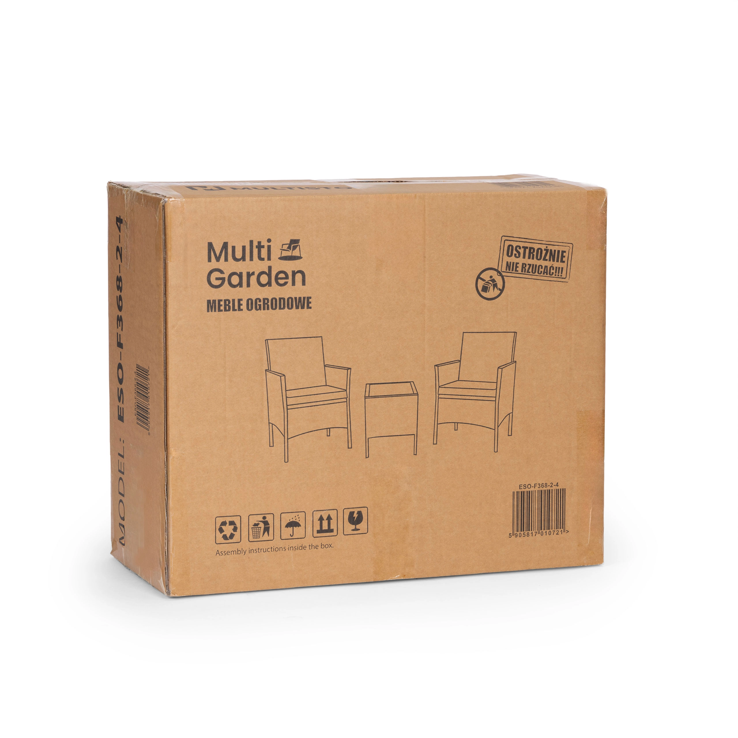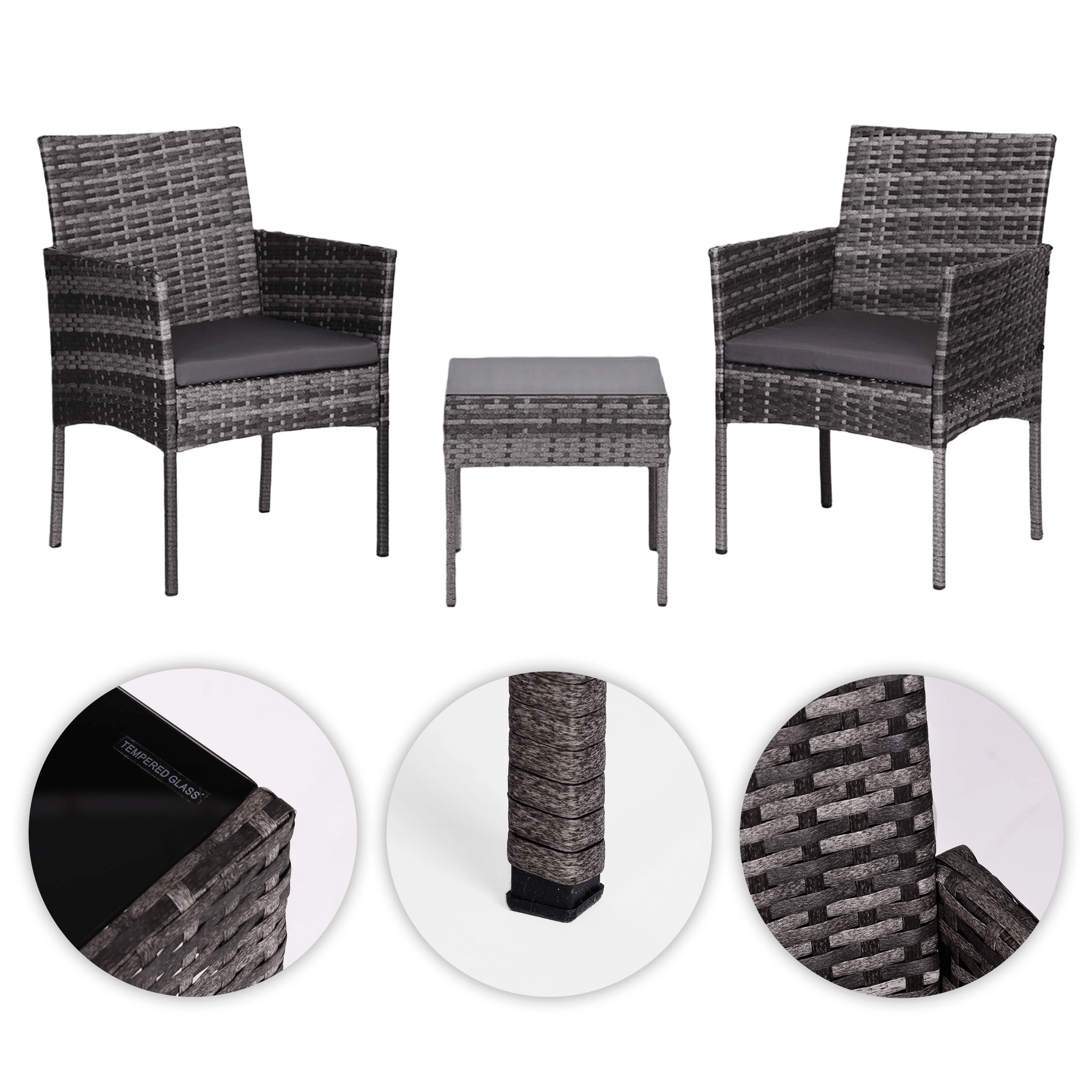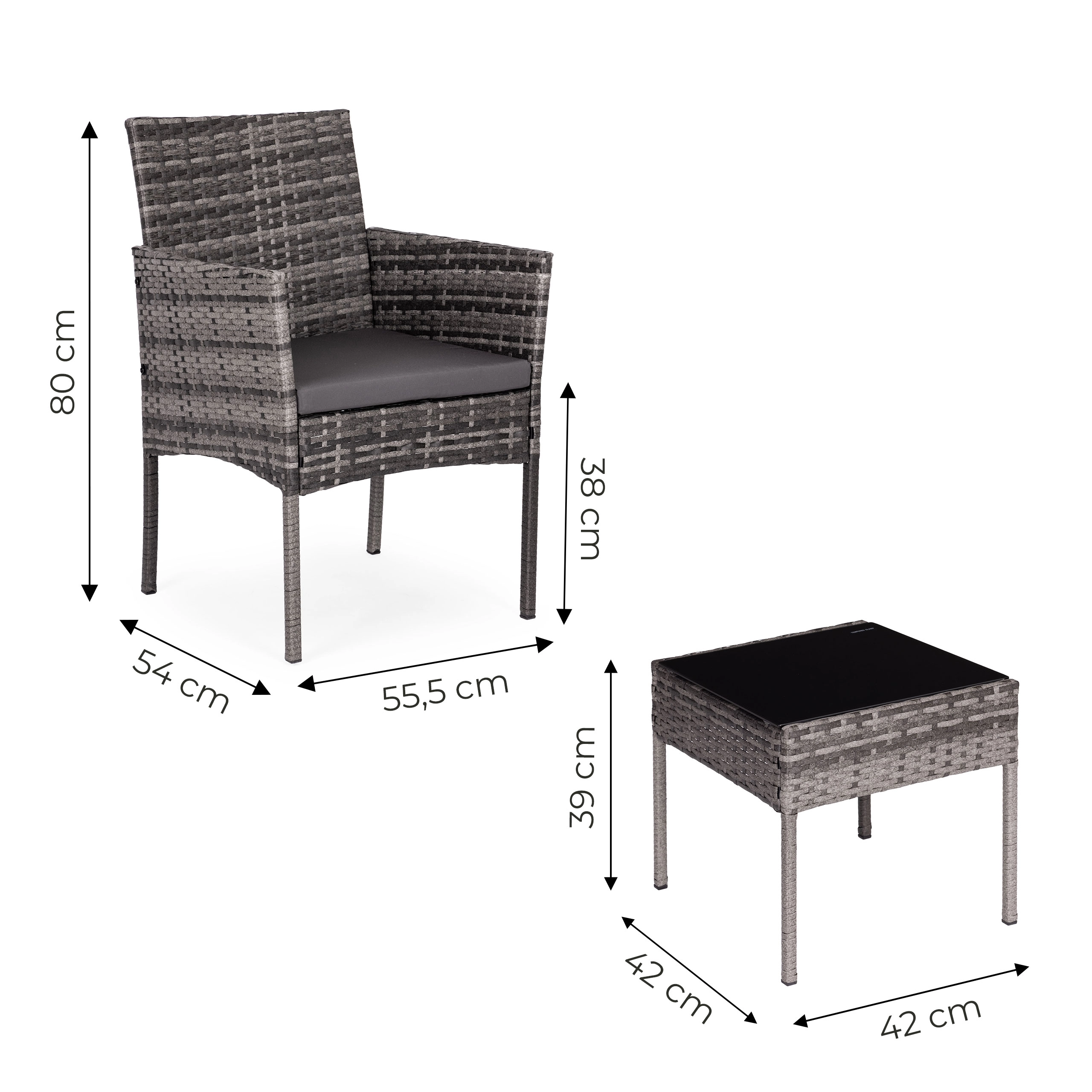 Stilski vrtni komplet za 2 osebi znamke MultiGarden združuje trpežno jekleno konstrukcijo in tehno ratan z kaljenim steklom na mizici. V kompletu sta 2 udobna fotelja z blazinami iz poliestera 160 g/m². Pohištvo je odporno na vremenske vplive, enostavno za čiščenje in odlično za teraso, balkon in vrt.