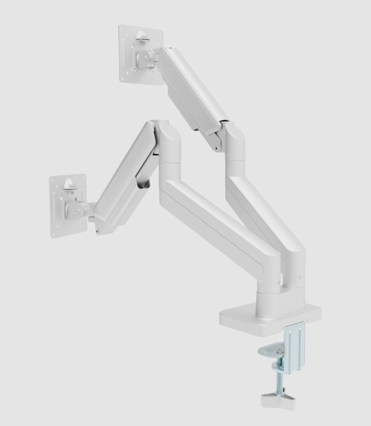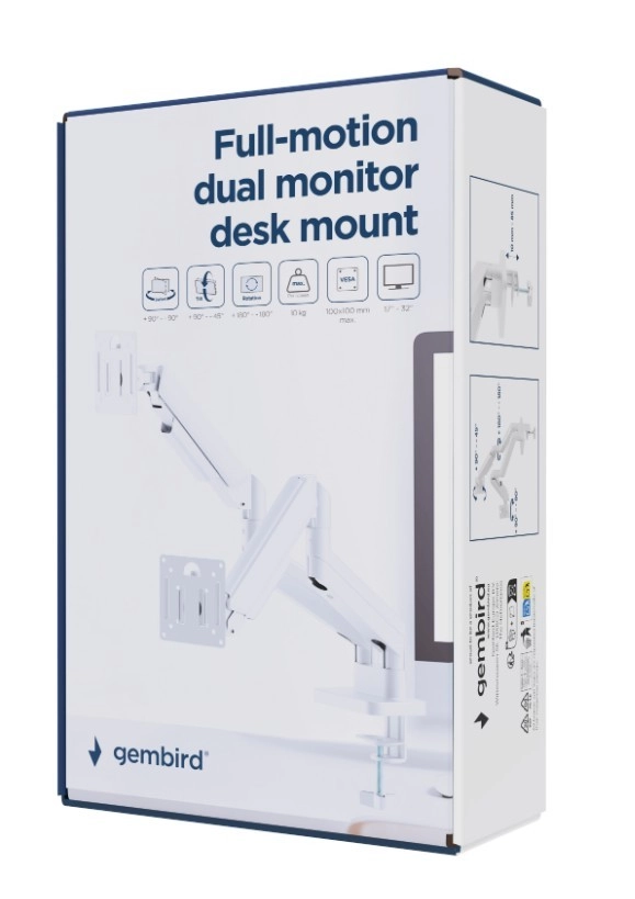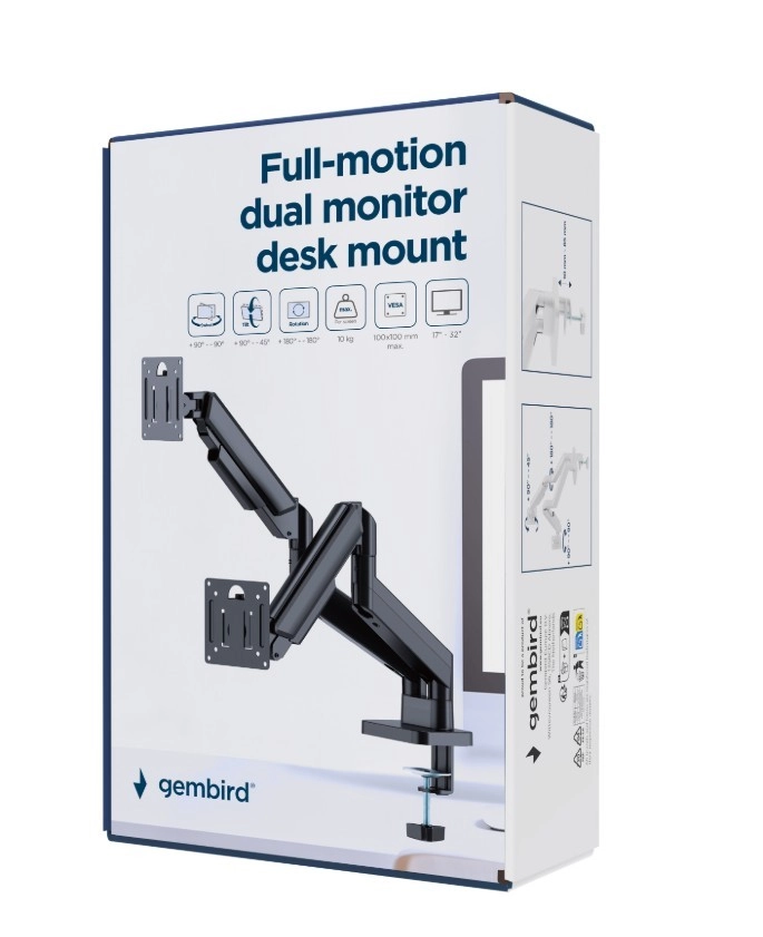 Izboljšajte ergonomijo in red na delovni mizi. Dvojna roka omogoča enostavno nastavitev položaja obeh monitorjev z eno roko – po višini zahvaljujoč plinskim vzmetem, levo-desno, naprej-nazaj, z možnostjo nagiba in vrtenja za 360° za delo v ležečem ali pokončnem načinu. Združljivost s skoraj vsakim LCD monitorjem 17–32" in standardom VESA 75×75 / 100×100 zagotavlja preprosto montažo.