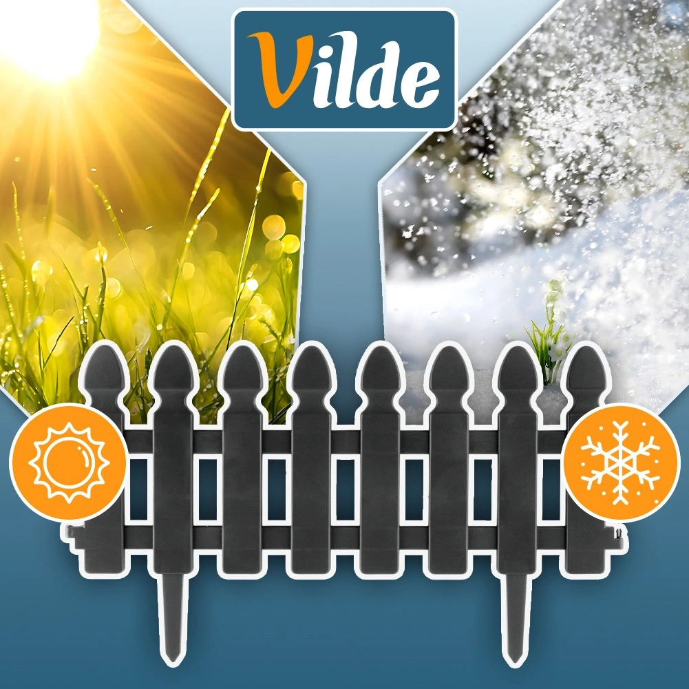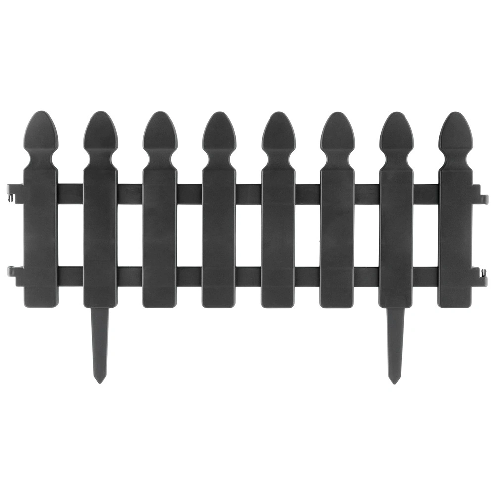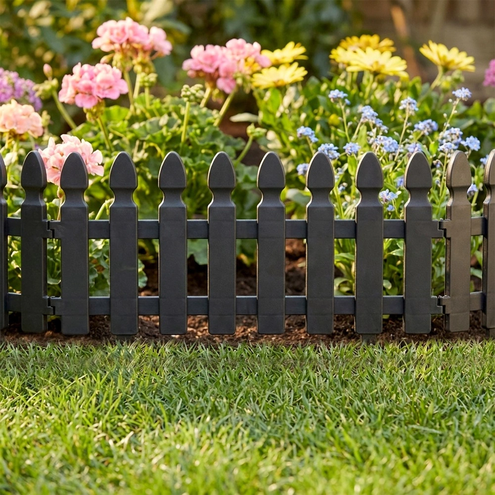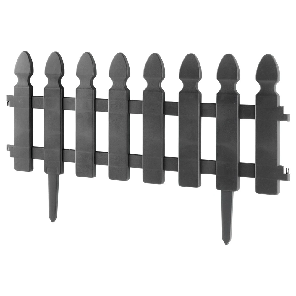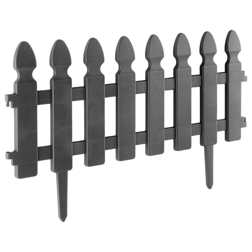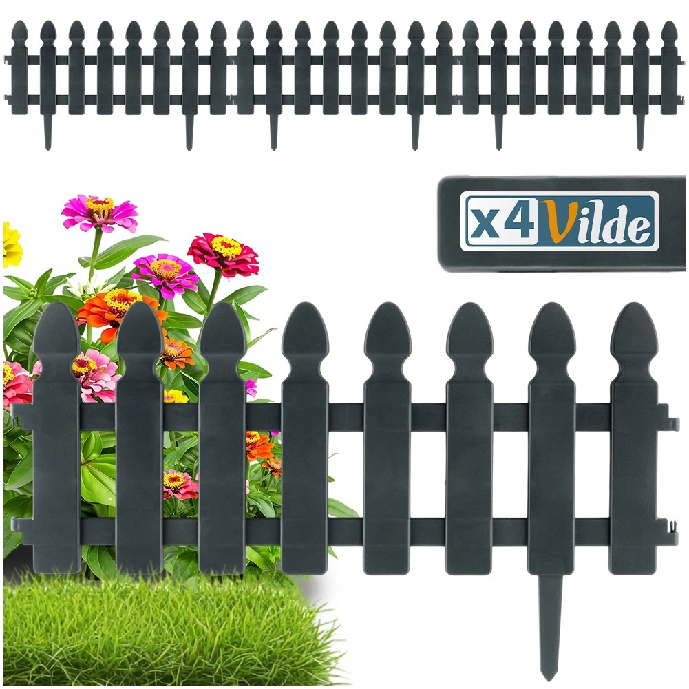 Praktičen set štirih sivih vrtnih ograjic za čisto ločevanje trate, gredic in poti. Vsak kos meri 49 × 21 cm, količki dolžine 7,5 cm zagotavljajo stabilno sidranje. Odporna plastična izvedba prenese mraz, UV-sevanje in dež. Elemente je mogoče preprosto povezovati v ravno linijo ali lok – skupna dolžina seta je približno 195 cm.