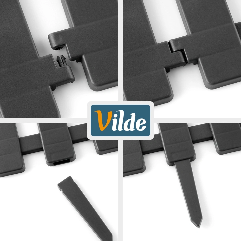 Vsak panel je opremljen z dvema vgrajenima količkoma za enostaven potisk v zemljo in zanesljivo sidranje. Stranske zaponke omogočajo modularno povezovanje več delov v želeno dolžino in obliko – ravno ali v loku. Montažo opravite brez orodja v le nekaj minutah.