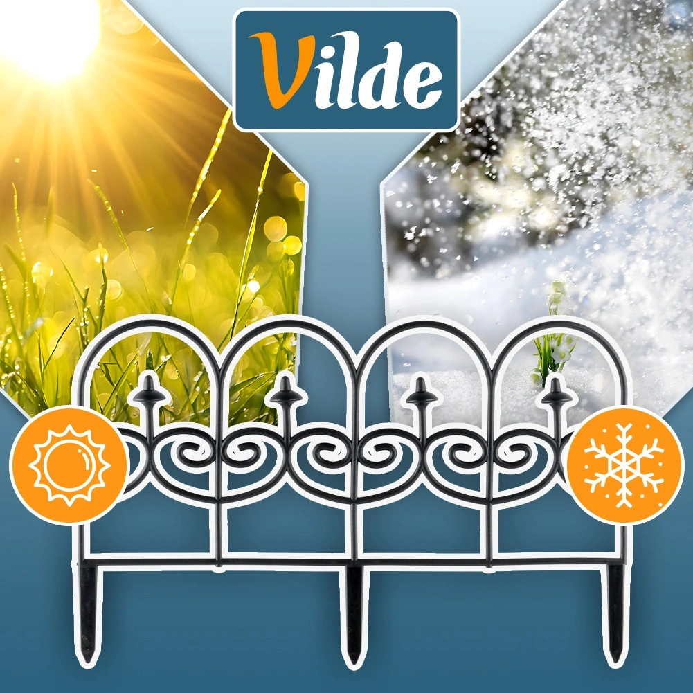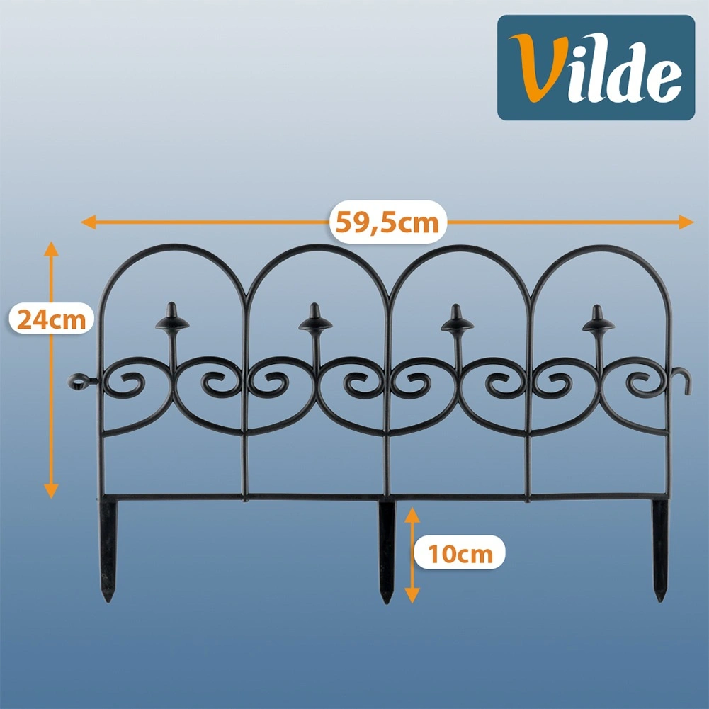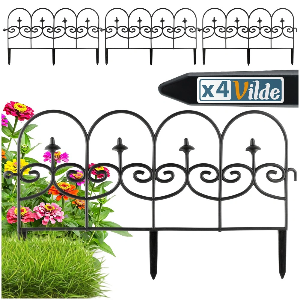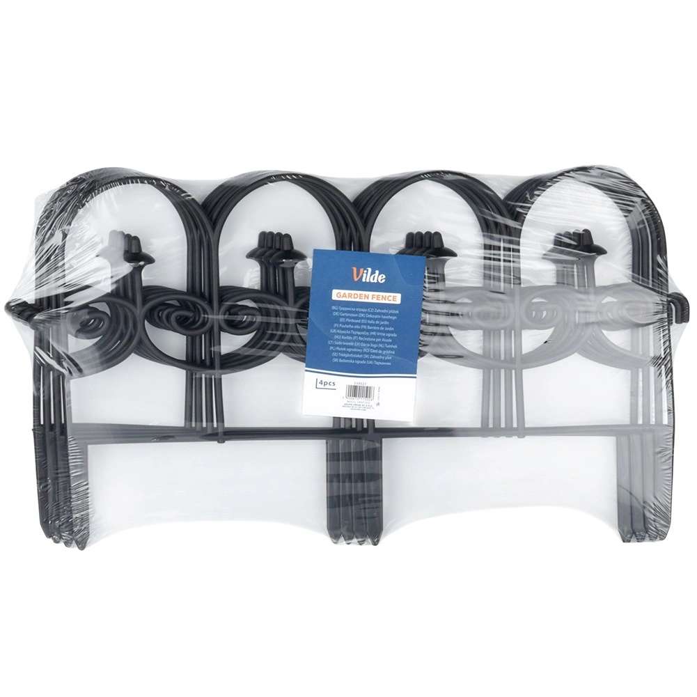 Set štirih dekorativnih vrtnih ograj v črni barvi omogoča hitro in urejeno ločevanje gredic, trate in poti. Vsak panel meri 59,5 cm v dolžino in 24 cm v višino (34 cm vključno s sidri), zato v ravni liniji ustvarite skupno dolžino 238 cm. Ograje so iz trpežnega materiala, enostavno se namestijo s pomočjo treh sidrnih konic in jih lahko med seboj poljubno povežete v želeno obliko in dolžino. Zahvaljujoč odpornosti proti zmrzali, UV-sevanju in dežju so idealne za celoletno uporabo ter zagotavljajo čiste linije gredic in zaščito rastlin.