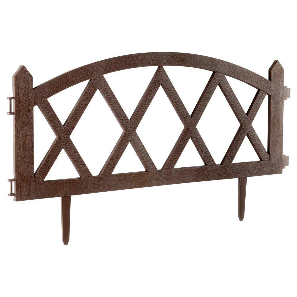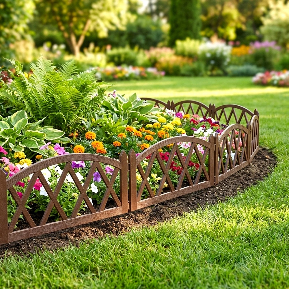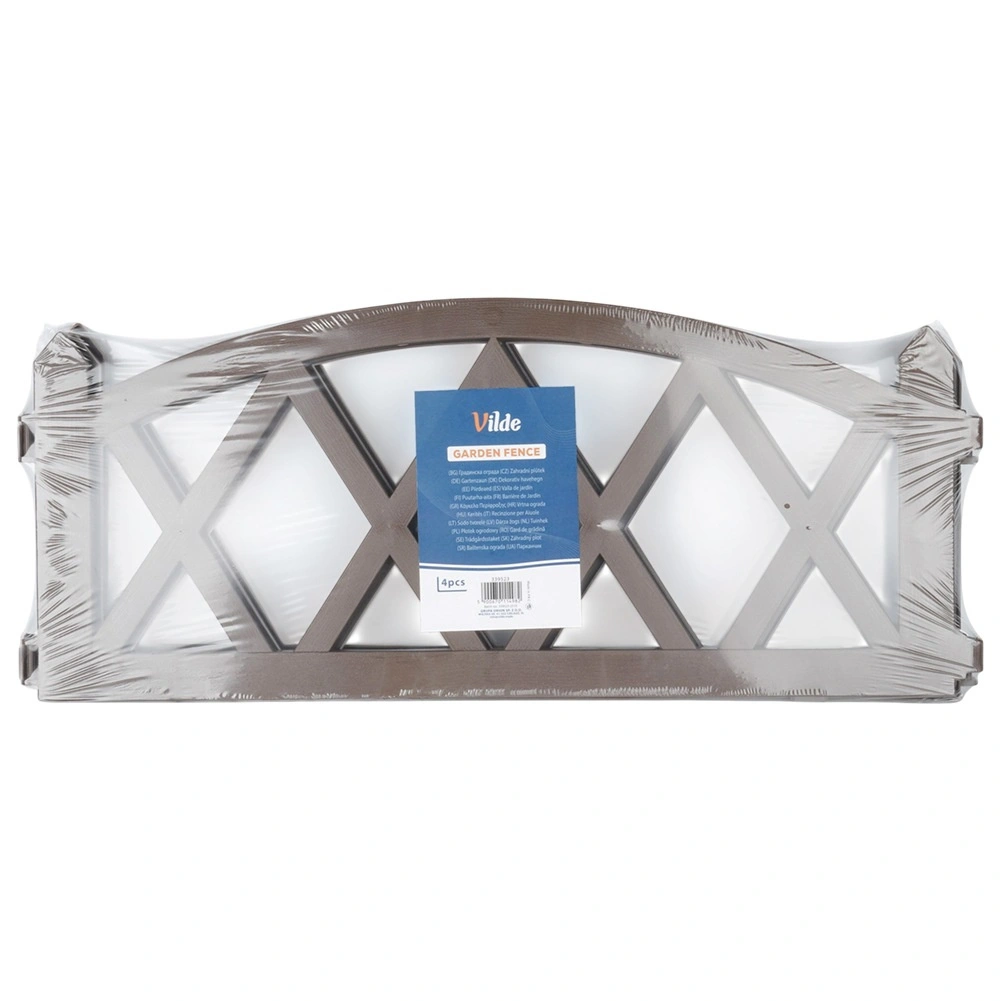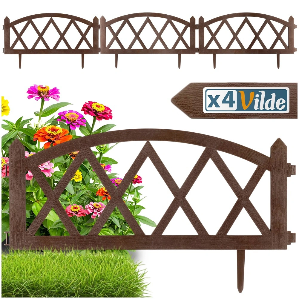 Praktična vrtna ograja v rjavi barvi za elegantno ločevanje gredic, trate in poti. Komplet 4 panelov 57 × 25 cm s trdnimi talnimi količki omogoča enostavno namestitev, modularno povezovanje v poljubno dolžino (do 228 cm v ravni liniji) ter odpornosti na mraz, UV in dež.