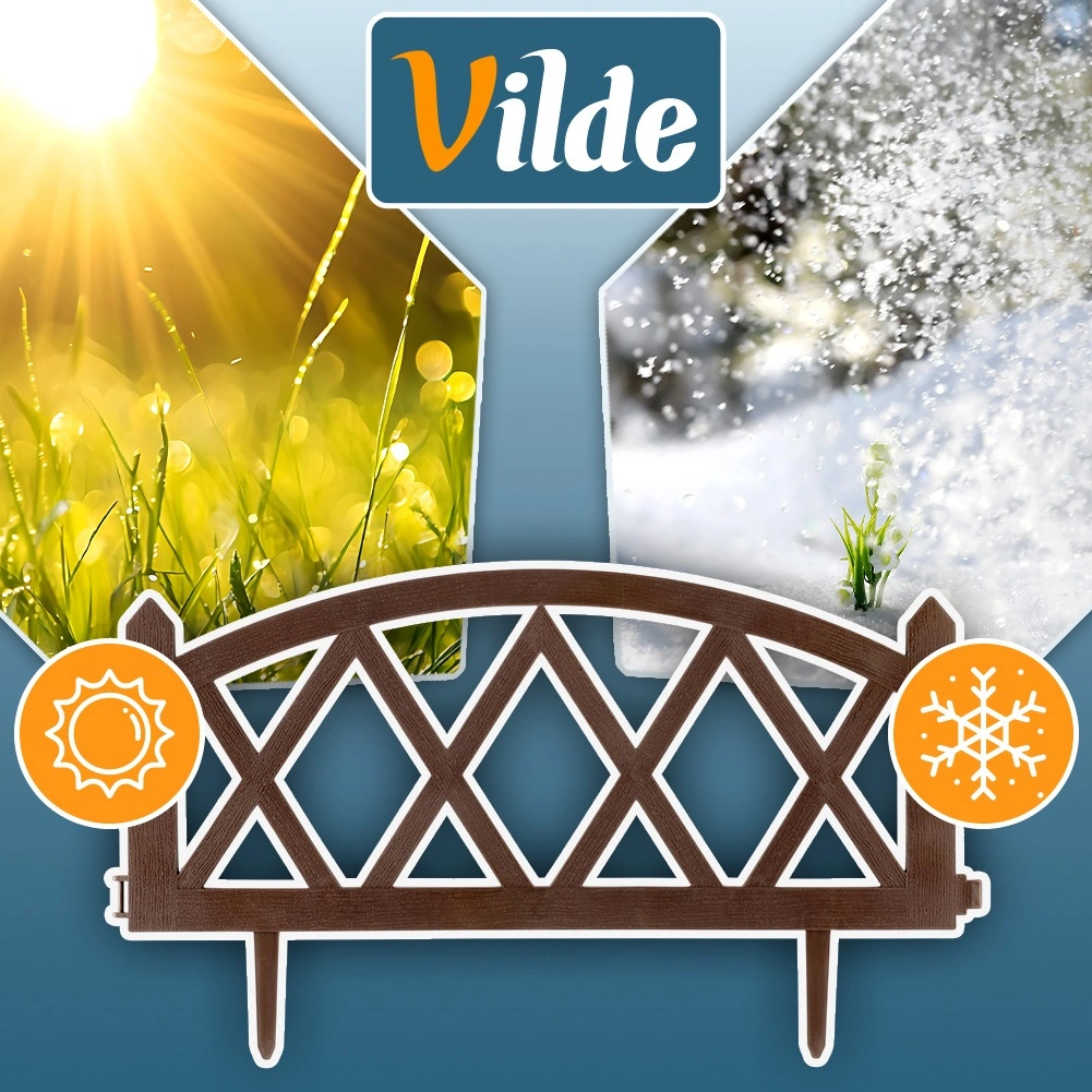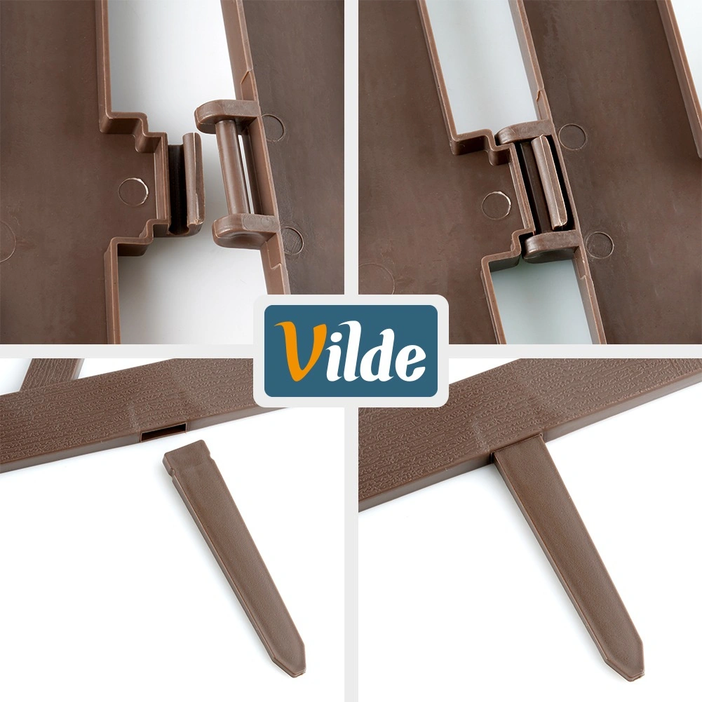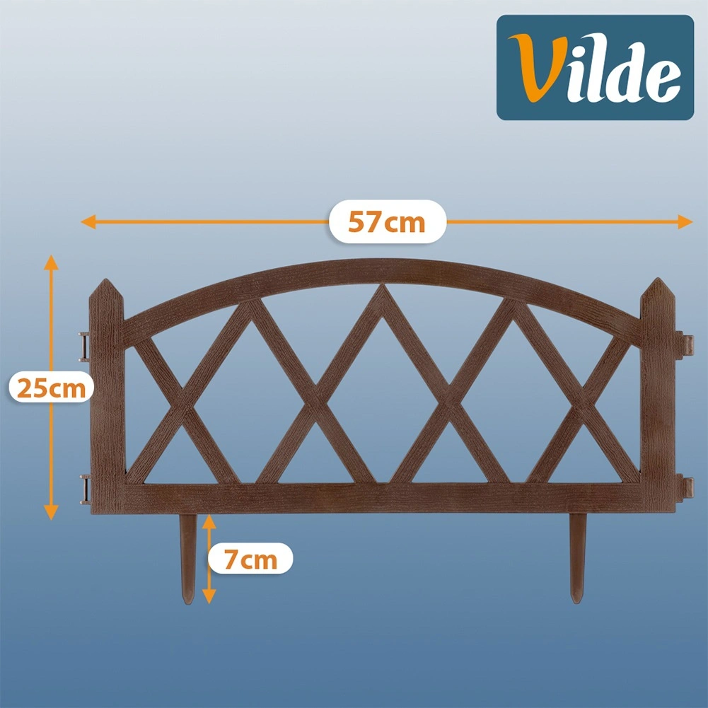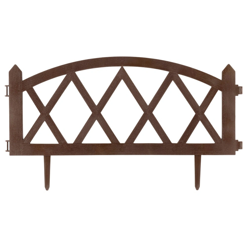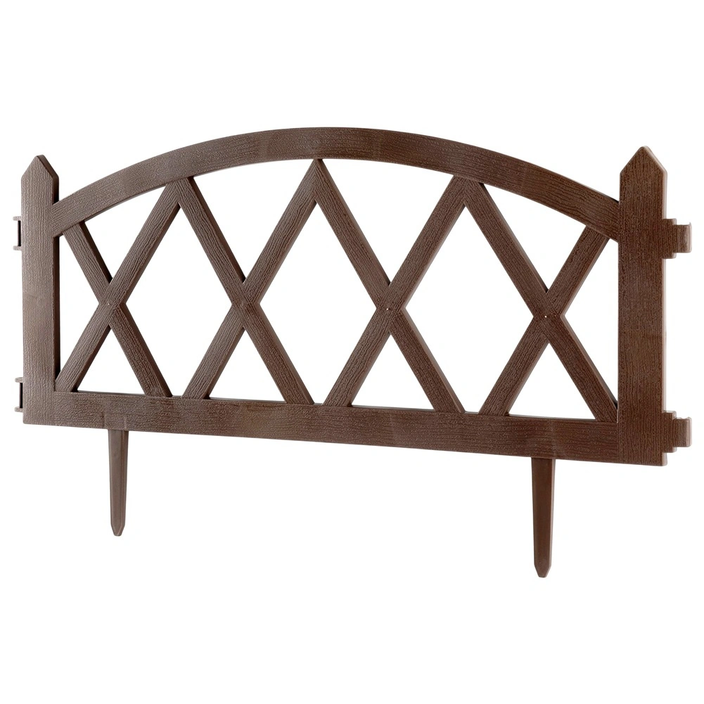 Praktična vrtna ograja v rjavi barvi za elegantno ločevanje gredic, trate in poti. Komplet 4 panelov 57 × 25 cm s trdnimi talnimi količki omogoča enostavno namestitev, modularno povezovanje v poljubno dolžino (do 228 cm v ravni liniji) ter odpornosti na mraz, UV in dež.