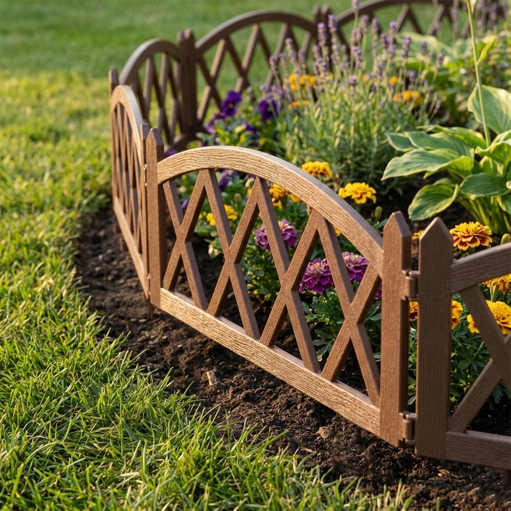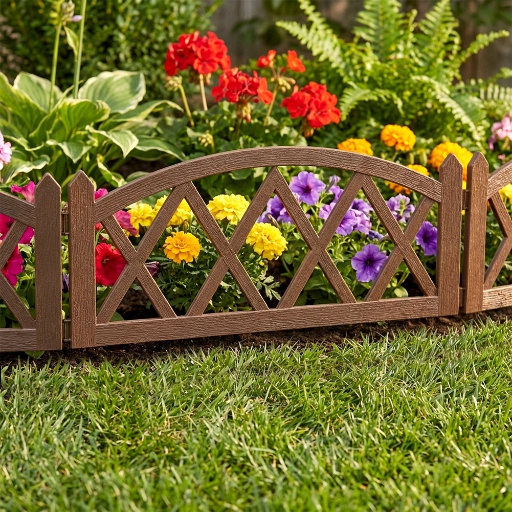 - Estetski videz – rjav lesni dekor in mrežast dizajn za urejen videz vrta.