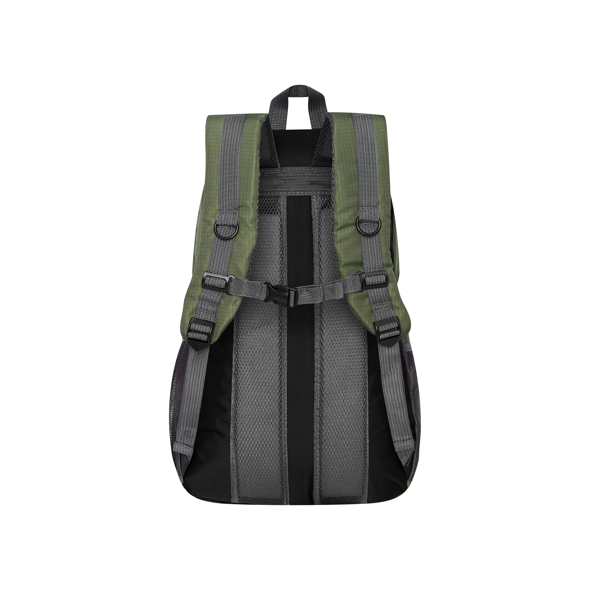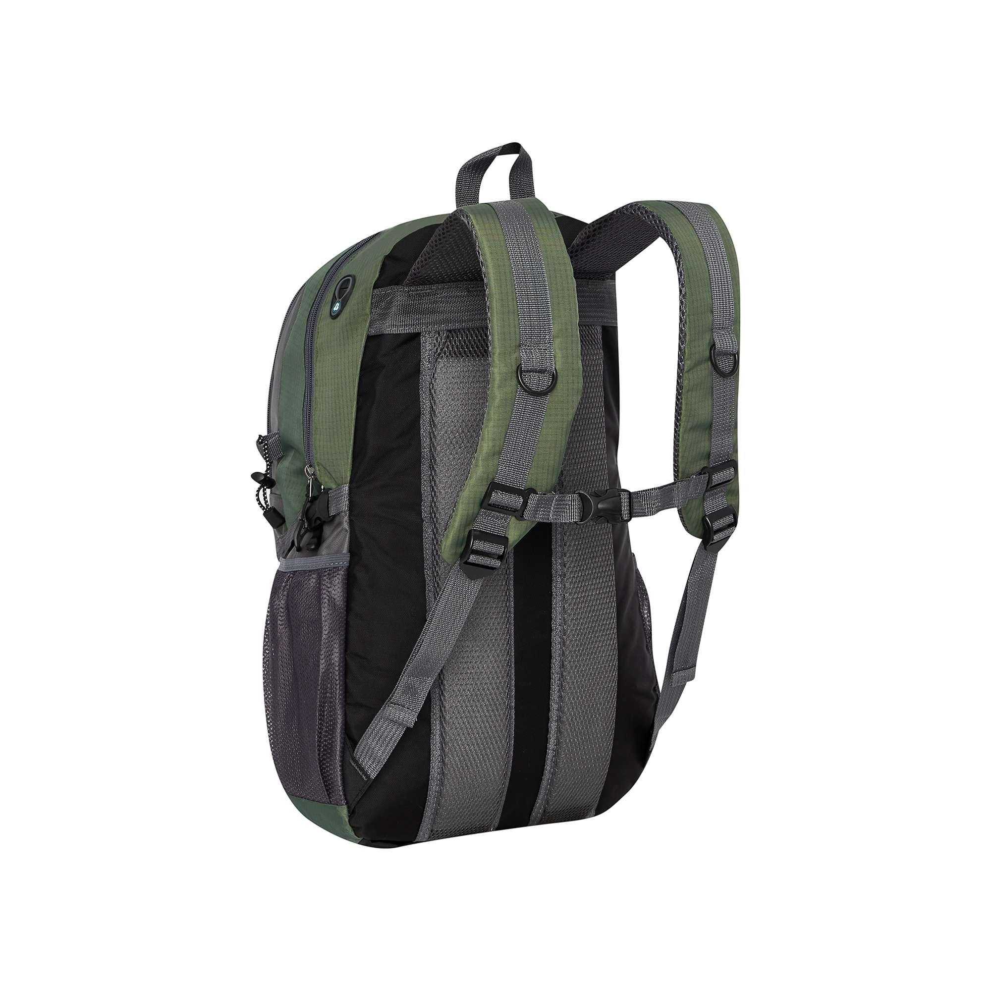 Glavni predal s pregrado, tri žepke na zadrgo, sprednji žep s sponko in dva stranska mrežasta žepa za steklenico ali opremo.