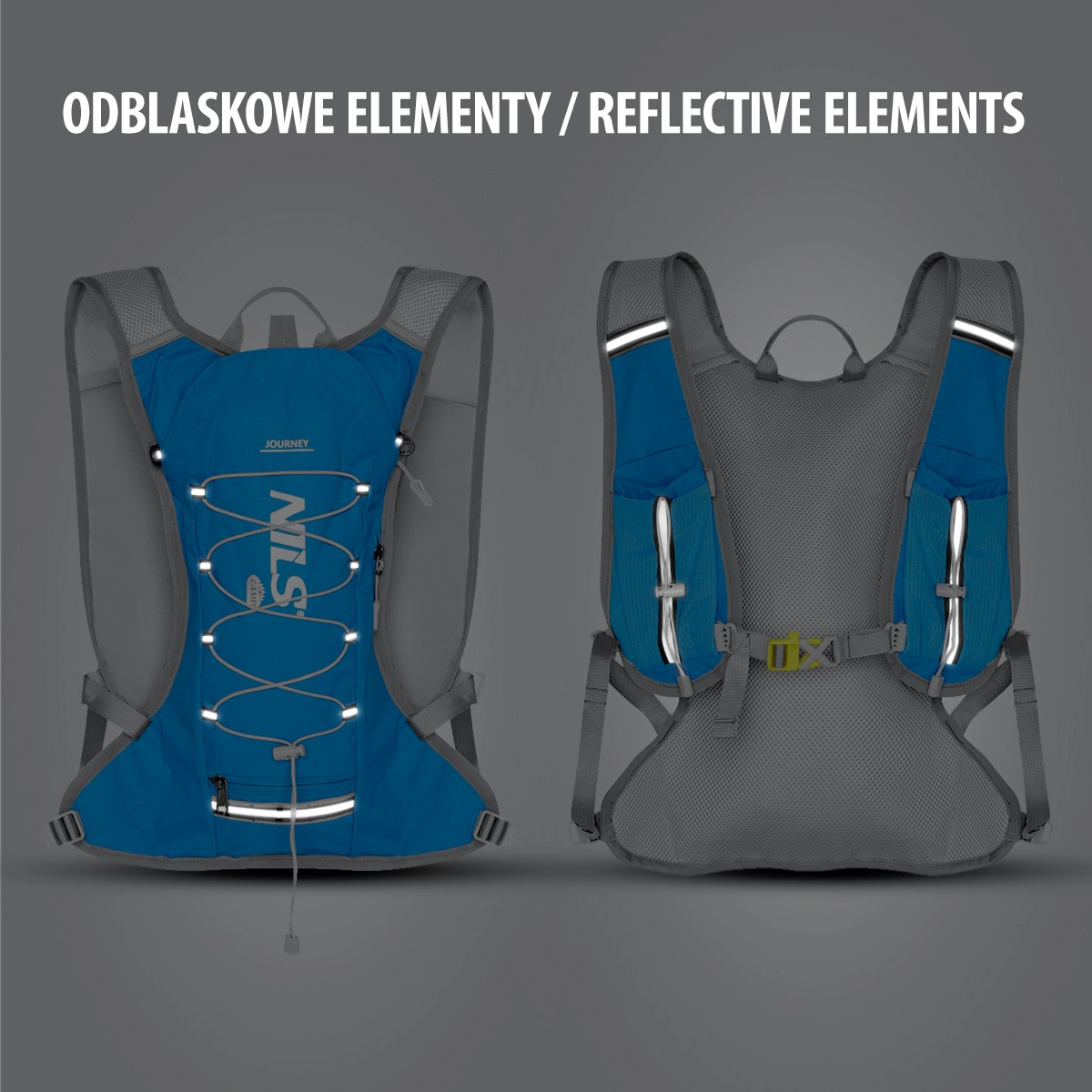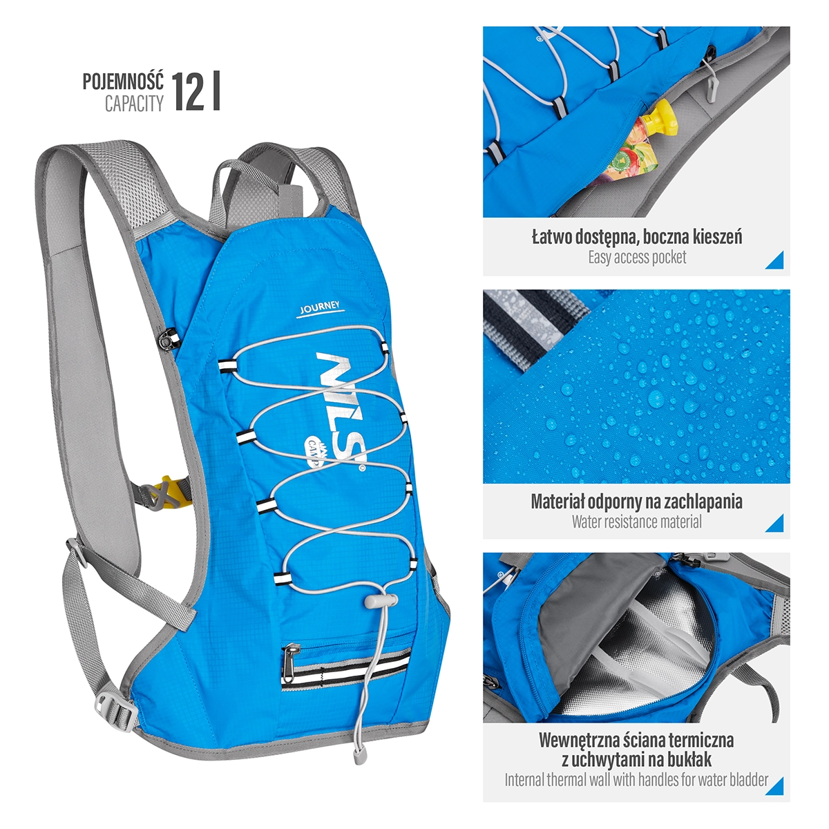 NILS Camp Journey je kompaktni 12-litrski nahrbtnik iz trpežnega najlona in poliestra, ki izstopa po nizki teži ter odpornosti na drgnjenje in škropljenje z vodo. Glavni predal je opremljen z aluminijasto folijo za toplotno izolacijo hidracijskega meha in dvema ježkoma za njegovo obešanje. Cev lahko napeljete na obe strani pod ramenskimi paneli – hidracija je tako vedno pri roki.