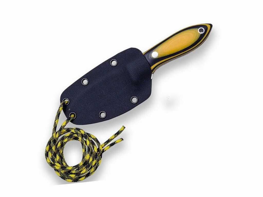 Ergonomska ročica iz materiala Micarta v črno-oranžni kombinaciji odlično sede v roko tudi vlažnim pogojem navkljub. Uho na koncu ročice omogoča napeljavo vrvice. Kydex tok s paracordom (1,3 m) omogoča diskretno in varno nošenje okrog vratu ali na opremi – odlična izbira za bushcraft, taborjenje in vsakodnevno nošenje (EDC).