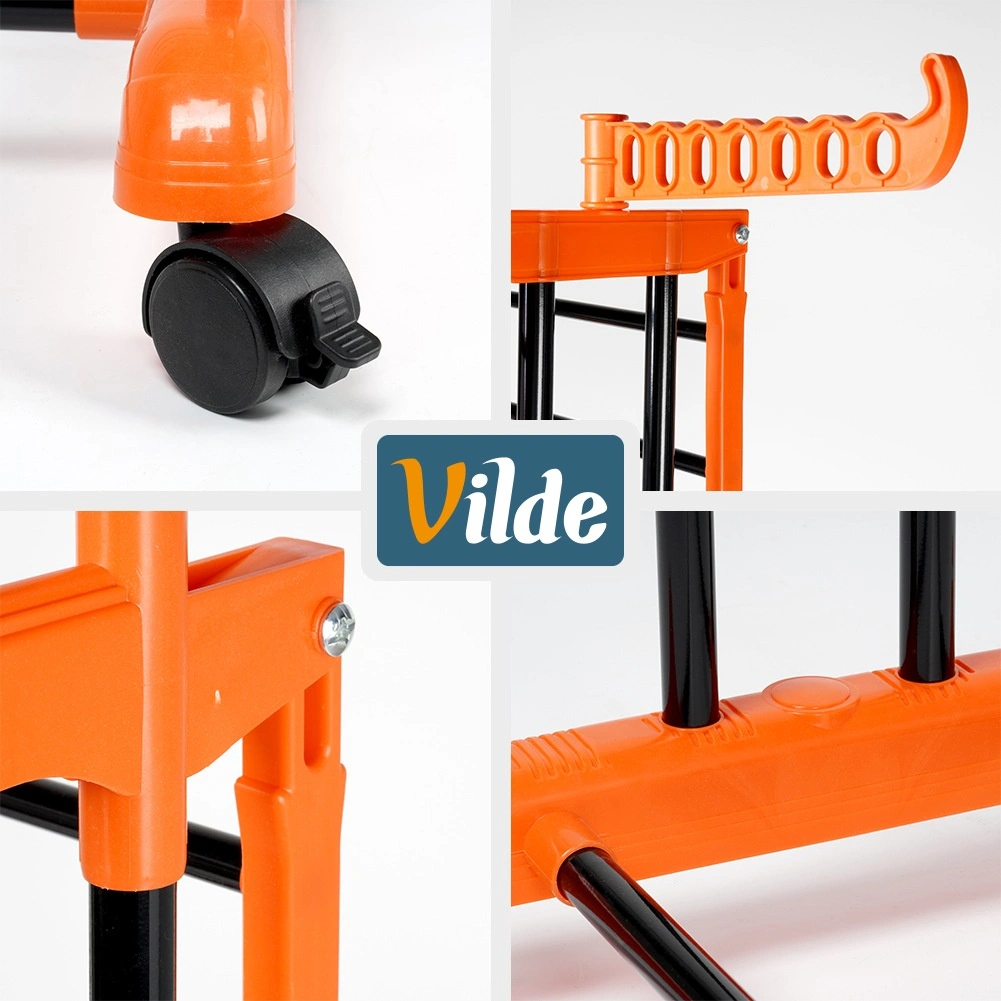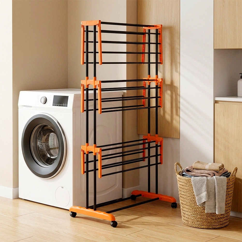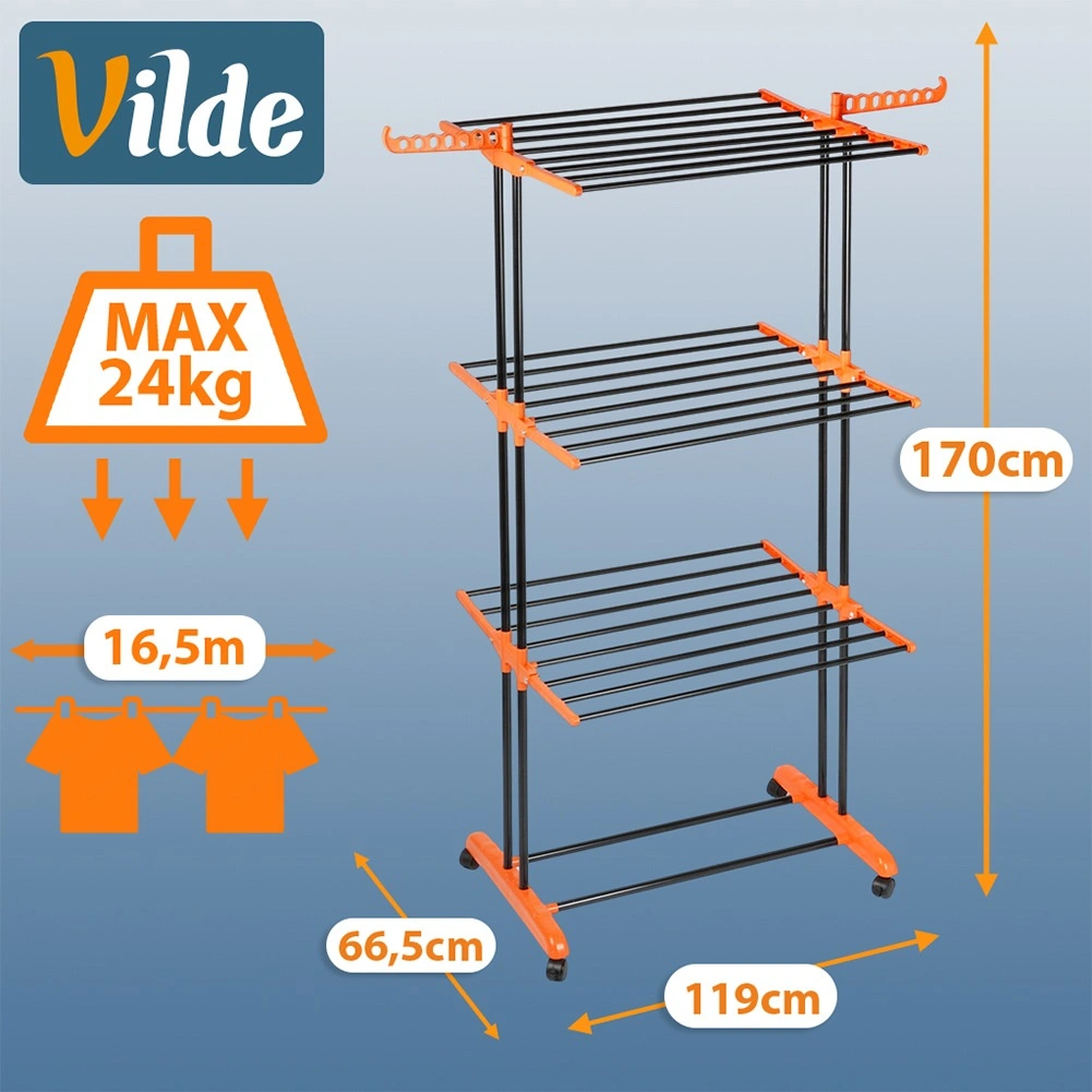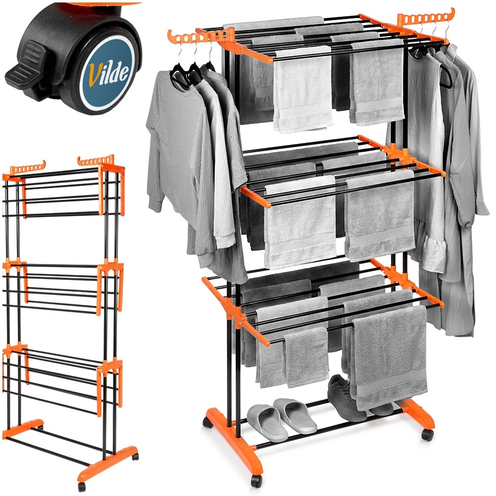 Navpično stojalo Vilde s tremi nivoji učinkovito prihrani prostor in vam omogoča sušenje velike količine perila na minimalni površini. Kovinske palice s prašnim premazom v črni barvi so odporne na vlago, oranžni plastični spojni elementi pa zagotavljajo stabilnost in dolgo življenjsko dobo. Razdalja 50 cm med nivoji izboljšuje kroženje zraka in pospeši sušenje.
